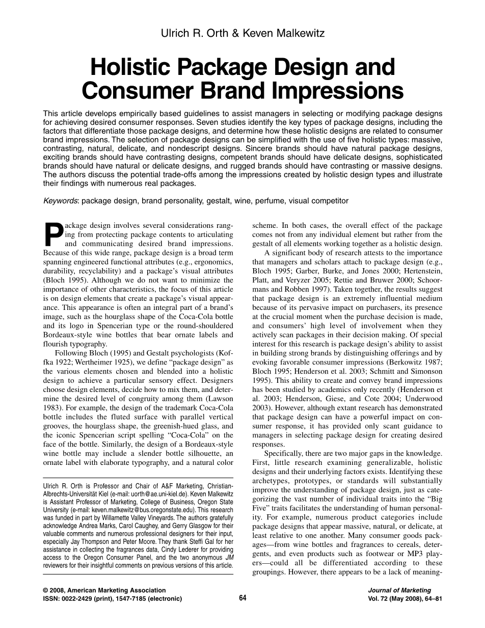 一个包装的设计引出了消费者的各种反应(参见Bloch 1995)。 与以前关于设计审美方面的工作(例如,Hirschman 1986; Holbrook 1986; Veryzer和Hutchinson 1998)不同,或者侧重于全球认知评估及其对消费者行为的影响(例如,Folkes和Matta 2004; Garber,Burke和 Jones 2000; Rahgubir和Krishna 1993; Schoormans和Robben 1997),我们的研究重点是从包装设计推断可概括的消费者品牌印象。