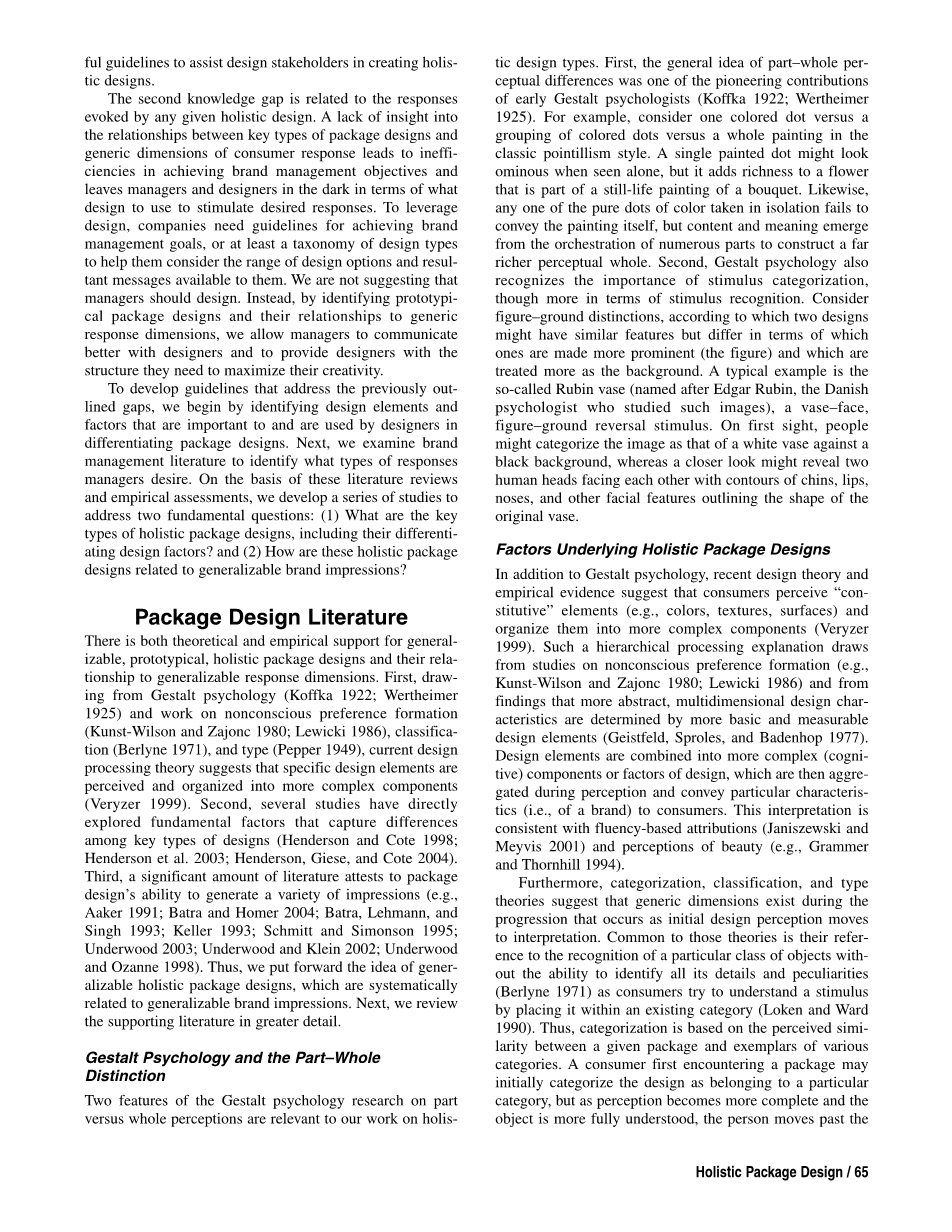 对可泛化,原型,整体包装设计及其与可广泛应用维度的关系,都有理论和经验支持。首先,从格式塔心理学(Koffka 1922; Wertheimer 1925)和非意识偏好形成工作(Kunst-Wilson和Zajonc 1980; Lewicki 1986),分类(Berlyne 1971)和类型(Pepper 1949),目前的设计处理理论表明特定的设计元素被感知和组织成更复杂的组件(Veryzer 1999)。第二,几项研究直接探索了主要类型设计之间差异的基本因素(Henderson和Cote 1998; Henderson et al。2003; Henderson,Giese和Cote 2004)。第三,大量的文献证明了包装设计产生各种印象的能力(例如,Aaker 1991; Batra和Homer 2004; Batra,Lehmann和Singh 1993; Keller 1993; Schmitt and Simonson 1995; Underwood 2003; Underwood and Klein 2002; Underwood and Ozanne 1998)。因此,我们提出了可概括的整体包装设计的概念,与可概括的品牌印象系统相关。接下来,我们更详细地回顾支持文献。