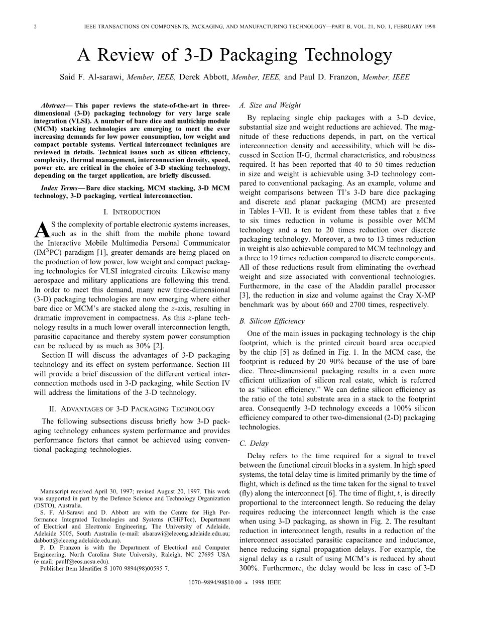 第二部分将讨论三维封装技术的优势及其对系统性能的影响。 第三节将简要讨论三维封装中使用的不同垂直相互连接方法,第四部分将讨论三维技术的局限性。