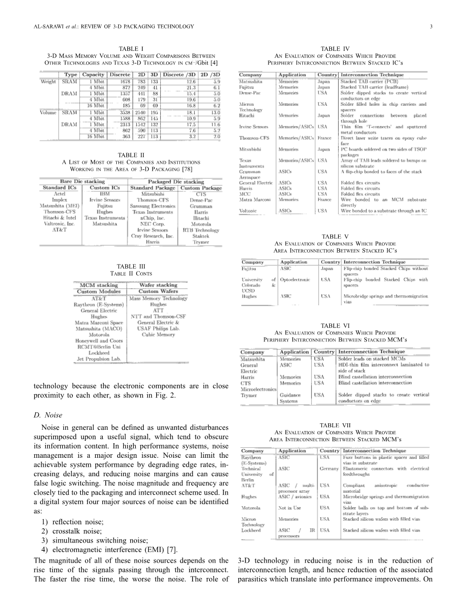 通过用3-D器件代替单芯片封装,实现了重量的大幅度减轻。这些削减的重要性在一定程度上取决于纵向互连密度和可访问性,这将在第II-G部分,热特性和所需的坚固性中得到讨论。据报道,与常规包装相比,使用3-D技术可以实现40至50倍的尺寸和重量的减小。作为一个例子,TI的3-D裸机封装和离散和平面封装(MCM)之间的体积和重量比较见表I-VII。从这些表中可以看出,MCM技术的体积减少了五到六倍,而离散的封装技术减少了10到20倍。此外,与MCM技术相比,重量减少了2至13倍,与分立组件相比,减少了3到19次。所有这些减少都是由于消除了与传统技术相关的头顶重量和尺寸。此外,在阿拉丁并行处理器[3]的情况下,与Cray X-MP基准相比,尺寸和体积的减少分别为约660和2700倍。