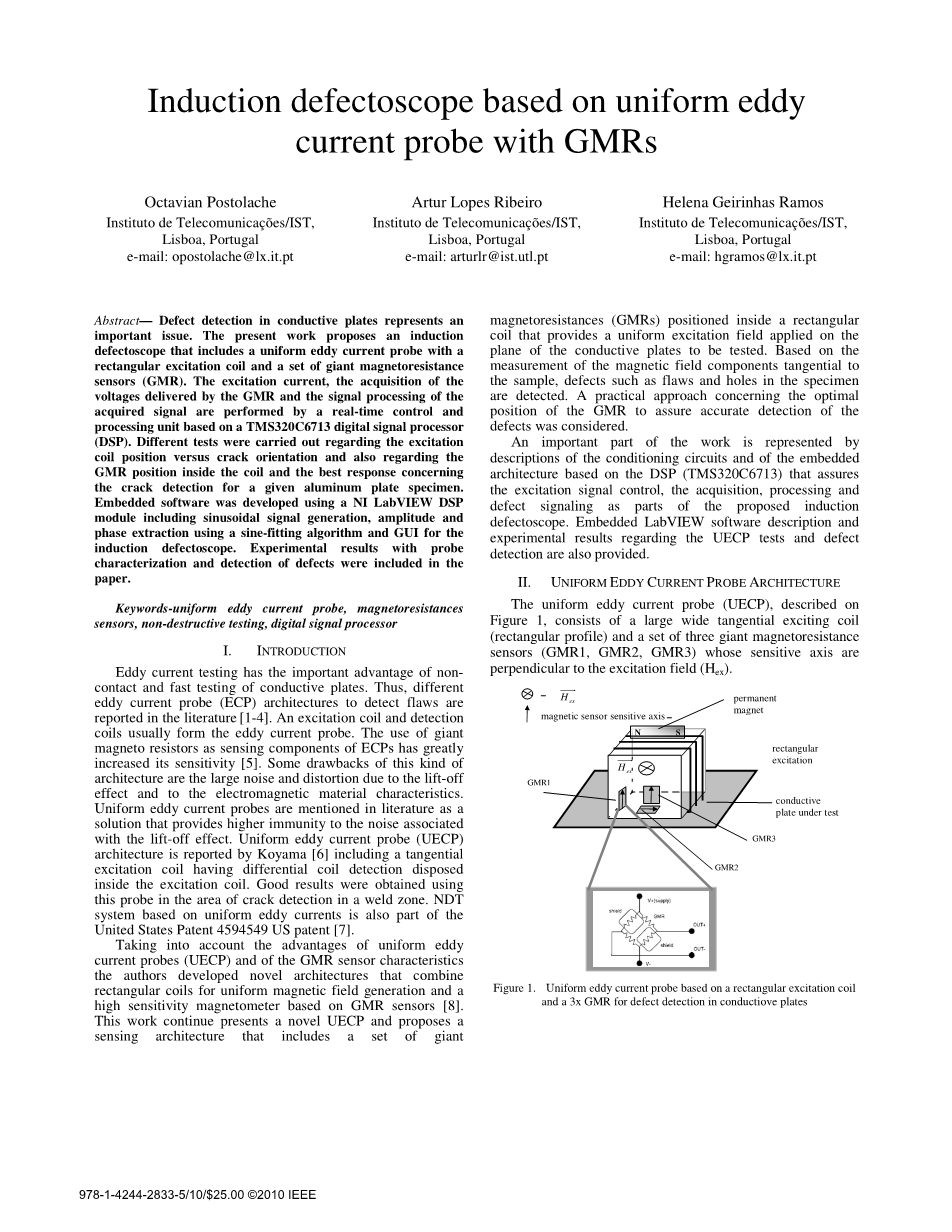 导电板中的缺陷检测是一个重要问题。目前的工作提出了一种感应探伤仪,其包括具有矩形激励线圈和一组巨磁阻传感器(GMR)的均匀涡流探头。激励电流,由GMR传送的电压的获取和所获取的信号的信号处理由基于TMS320C6713数字信号处理器(DSP)的实时控制和处理单元执行。对激励线圈位置与裂纹取向的关系以及线圈内部的GMR位置和给定铝板试样的裂纹检测的最佳响应进行了不同的测试。嵌入式软件是使用NI LabVIEW DSP模块开发的,包括正弦信号生成和使用正弦拟合算法和GUI用于感应探头的幅度和相位提取。文章中包括探针表征和缺陷检测的实验结果。