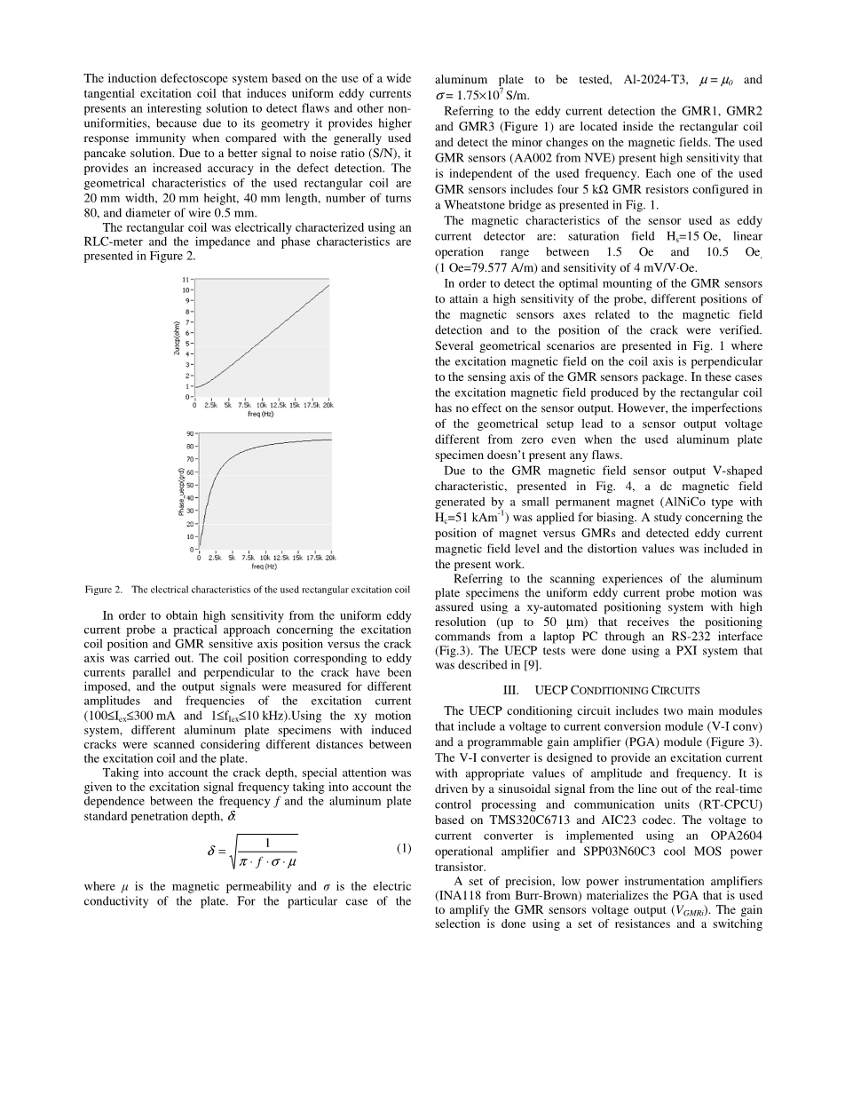 参考涡流检测,GMR1,GMR2和GMR3(图1)位于矩形线圈内,检测磁场的微小变化。使用的GMR传感器(来自NVE的AA002)具有高灵敏度,与使用频率无关。每个GMR传感器都包括四个5的GMR电阻,配置在惠斯通电桥中,如图1所示。用作涡流检测器的传感器的磁特性是:饱和磁场Hs = 15,线性工作范围在1.5和10.5之间,(1 = 79.577A / m),灵敏度为4mV/V·。