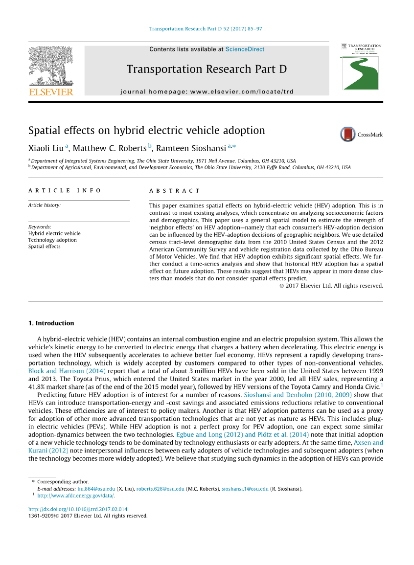 根据Musti和Kockelman(2011),单位车辆价格,车辆类型或类别,以及燃料经济性是最多的影响车辆采用决策的重要因素。Curtin等人(2009)研究经济因素的影响,环境态度和对HEV采用的非经济态度。他们得出结论,虽然经济考虑对HEV购买概率,环境和其他非经济态度有显着影响更大的影响。他们还提供可以估计不同家庭的HEV购买概率的模型关于社会经济和人口变数,包括居住地区(即城市与农村)。虽然居住地区包含在这个模型中,它没有明确捕获空间效果。尽管如此,他们的研究建议一些聚类的HEV采用,由于具有类似社会经济学和人口统计学的个人聚类。 Gallagher和Muehlegger(2011)研究了不同激励机制(如税收补贴)对消费者的相对效果HEV采用。与Curtin等人的工作一样(2009),这种分析忽略了空间效应。Rezvani等人(2015)提供对消费者采用PEV的驱动因素和障碍的全面概述。他们的工作重点消费者对PEV的看法,因为这是技术采用的重要驱动力。