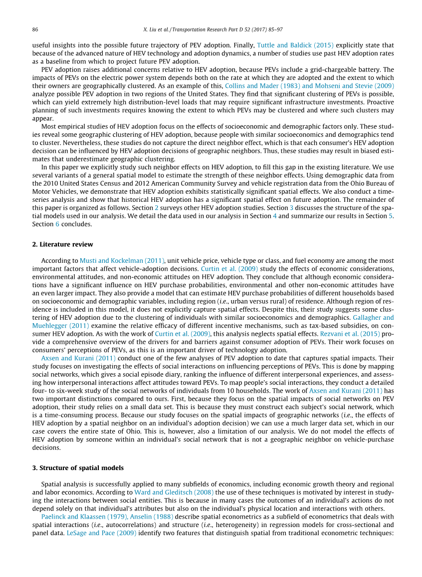 在本文中,我们明确研究这种邻域效应对HEV采用,填补这个差距在现有的文献。 我们用一般空间模型的几个变体来估计这些邻域效应的强度。 使用受众特征数据2010年美国人口普查和2012年美国社区调查和车辆登记数据从俄亥俄州汽车,我们证明HEV采用表现出统计上显着的空间效应。 我们也进行时间序列分析并表明历史HEV采用对未来采用具有显着的空间效应。 其余的本文组织如下。 第2节调查其他HEV采用研究。 第3节讨论空间的结构模型用于我们的分析。 我们详细描述了第4节中我们的分析中使用的数据,并在第5节总结了我们的结果,最后第6节总结。
