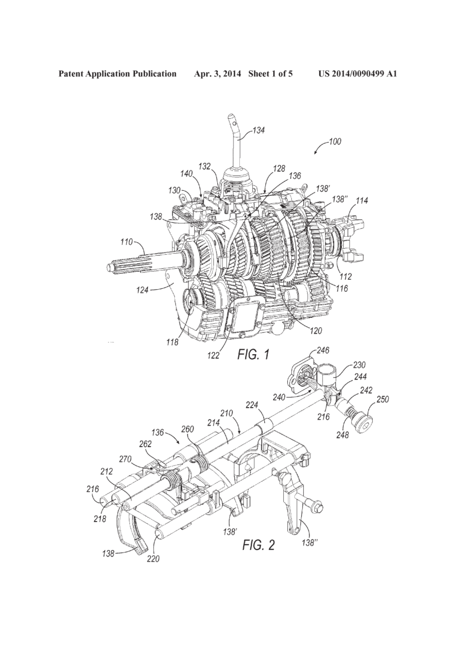 [0030]继续参考图1,上壳体部分128配置有换档杆壳体130。此外,控制单元132从换档杆壳130延伸到换档杆134。控制单元132可以包括具有轴向调整元件的十字接头,以增加换档选择,同时减少换档杆134中的任意自由间隙。换档杆壳体130配置有保持和调整换档控制系统136。控制系统136可将换档杆134的运动转换到至少一个换档叉138上,以便从多个齿轮120中选择所需的齿轮组以确定预估的输出。此外,换档拨叉138可接合的至少一部分的同步器140来选择预定的齿轮组,下面更详细地讨论。