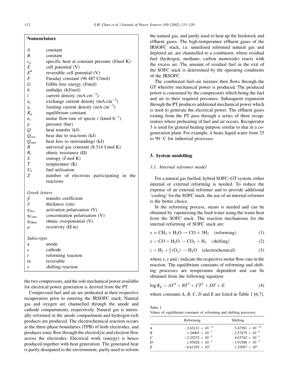 其中,x,y和z表示反应中各自的摩尔比率。重整和转换过程的平衡常数是与温度相关的,可以按3.4式算出。