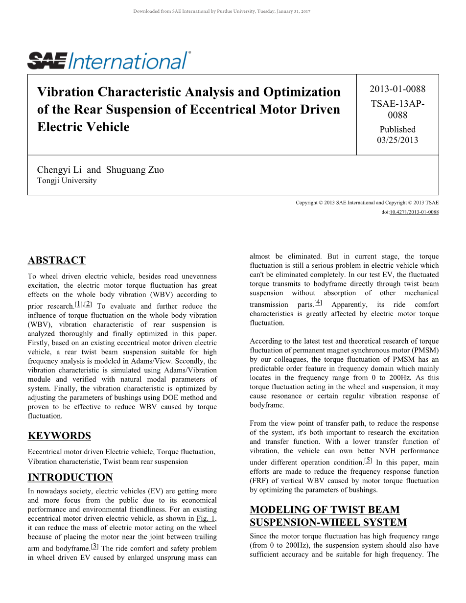 关键字:偏心电机驱动型电动车;扭矩波动;振动特性;扭转梁式后悬架