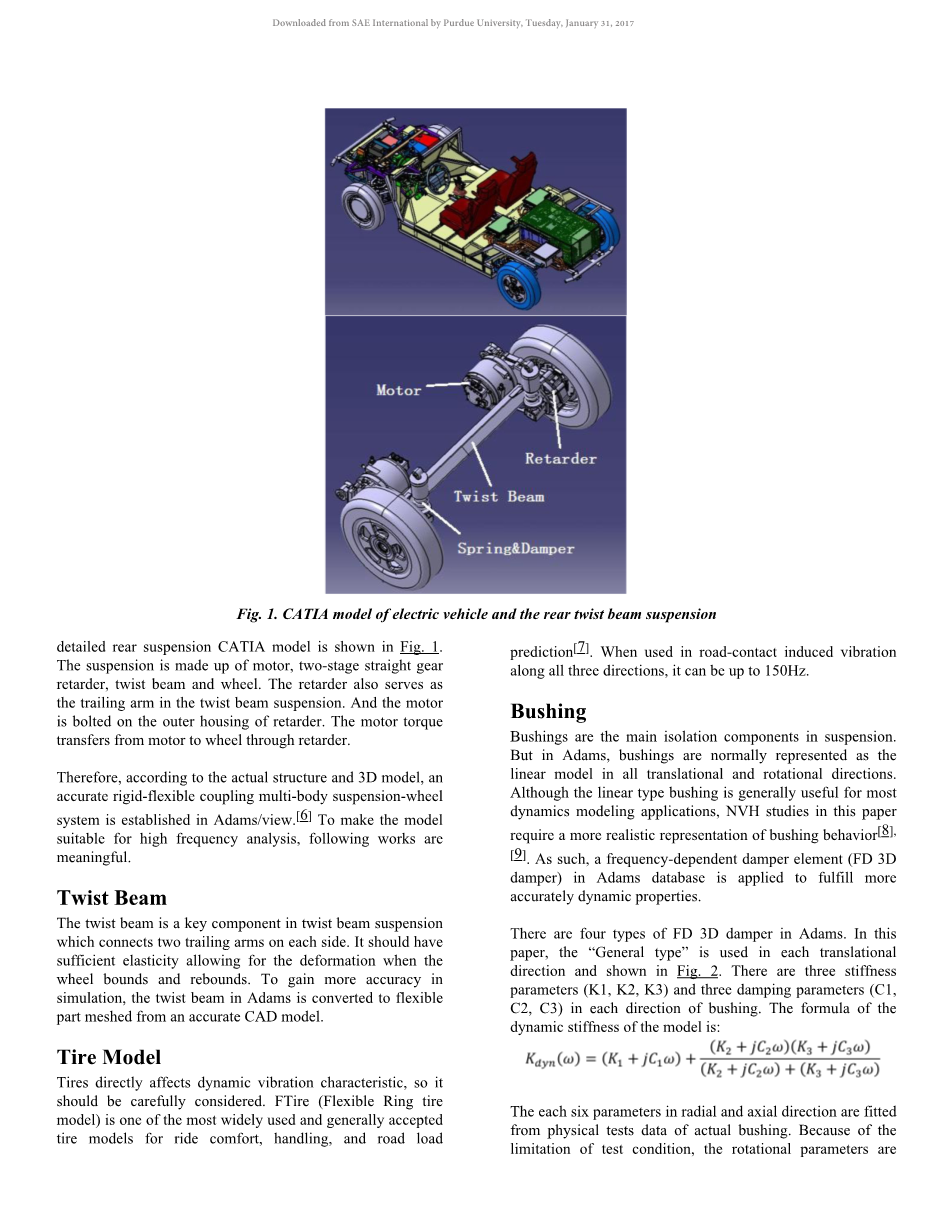 摘要:对于车轮驱动的电动汽车,根据之前的研究,除路面不平激励外,电机扭矩波动对车辆全身振动有很大影响。为了评估并进一步减少扭矩波动对车辆全身振动的影响,本文对后悬架的振动特性进行彻底分析最终进行优化。首先,基于现有的偏心电动机驱动的电动车辆,适用于高频分析的后扭梁悬架用Adams/View进行建模。其次,使用Adams / Vibration模块模拟振动特性,并用系统的自然模态参数进行验证。最后,通过使用DOE方法调节衬套的参数来优化振动特性,并且证明其能有效地减小由扭矩波动引起的整车振动。