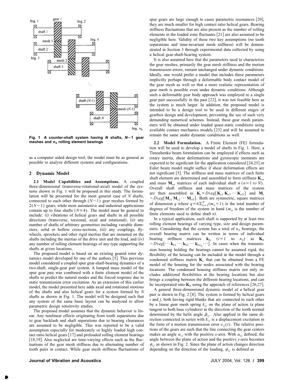 该模型假定的动态行为是线性的。源自牙齿分离的任何非线性效应齿轮间隙和由于轴承间隙的轴分离被假定为可以忽略不计。这是一个有效的报告,特别适用于中等或高负荷的高接触比斜齿轮和滚动轴承。同时它也忽略了时间变化的影响,如波动齿轮啮合刚度由于交变数接触齿对。齿轮啮合刚度波动时直齿圆柱齿轮是大到足以引起参数共振,它们是小得多的高接触比斜齿轮。轴承刚度波动,也出现了轧制数量在加载区元素的波动,这也被认为是可以忽略不计。这两个关键假设(有效性分离和时不变网格刚度)将通过实验数据收集使用斜齿轮-轴-轴承系统显示在第3节。