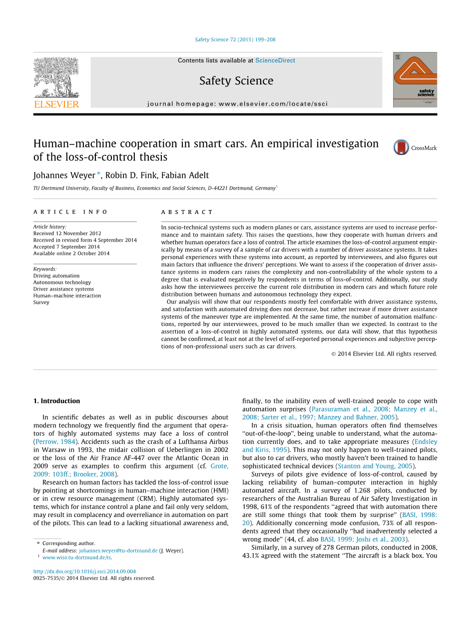摘要:在社会技术系统中的比如现代飞机或汽车,很多辅助系统都用来提高性能和维持安全。这就提出了以下问题,它们怎么和司机合作,还有操作者是否会面临失控这个问题。这篇文章通过一个关于一个汽车司机们和一些驾驶员辅助系统的例子来从经验上说明失控论点。考虑了个人经验和这些系统,据被访问者的报告,也得到了影响司机认知的主要因素。我们想评估在现代汽车中驾驶员辅助系统的合作是否增加了复杂性和提高整个系统的不可控性到一个用在失控的调查对象来消极评价的度。此外,我们的研究也涉及了被采访者认知的在现代汽车中的角色分配情况,还有他们期望的未来汽车中人类和自动技术的分配情况。我们的分析会展示出在驾驶员辅助系统中被访问者大多感到舒适,和对自动驾驶的满意度并没有下降,相反会增加,如果更多驾驶员辅助系统的策略被应用。与此同时,我们的受访者报告的自动化故障的数量,也是比我们预期的要小得多。和高度自动化系统的失控理论相反,我们的数据表明,这个假设不能确认,至少在自我报告的自我经验和非专业的用户比如司机的主观认知的层面上。