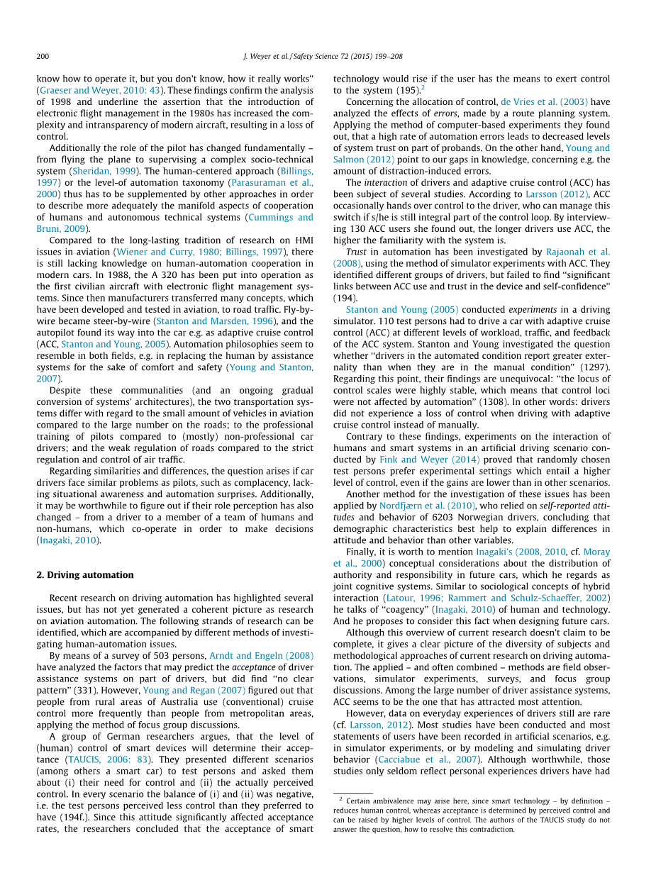 与长期的在飞行业的传统人机交互问题的研究想比,(Wiener and Curry, 1980; Billings, 1997),在现代汽车中的人机交互合作的知识依然很欠缺。在1988年,A320号就已经用于实际了,它是第一架民用的搭载电子飞行管理系统的飞机。从那时开始制造商改变了很多概念,从已经发展成熟和在久经考验的飞行制造业,转变到道路交通。线控飞行转变为线控转向(Stanton and Marsden, 1996),还有飞机自动驾驶仪传播到汽车中,比如自适应巡航控制(ACC, Stanton and Young, 2005)。自动化的道理在这两个领域貌似很类似,比如用辅助系统来代替人类以达到舒适和安全的效果(Young and Stanton,2007)。