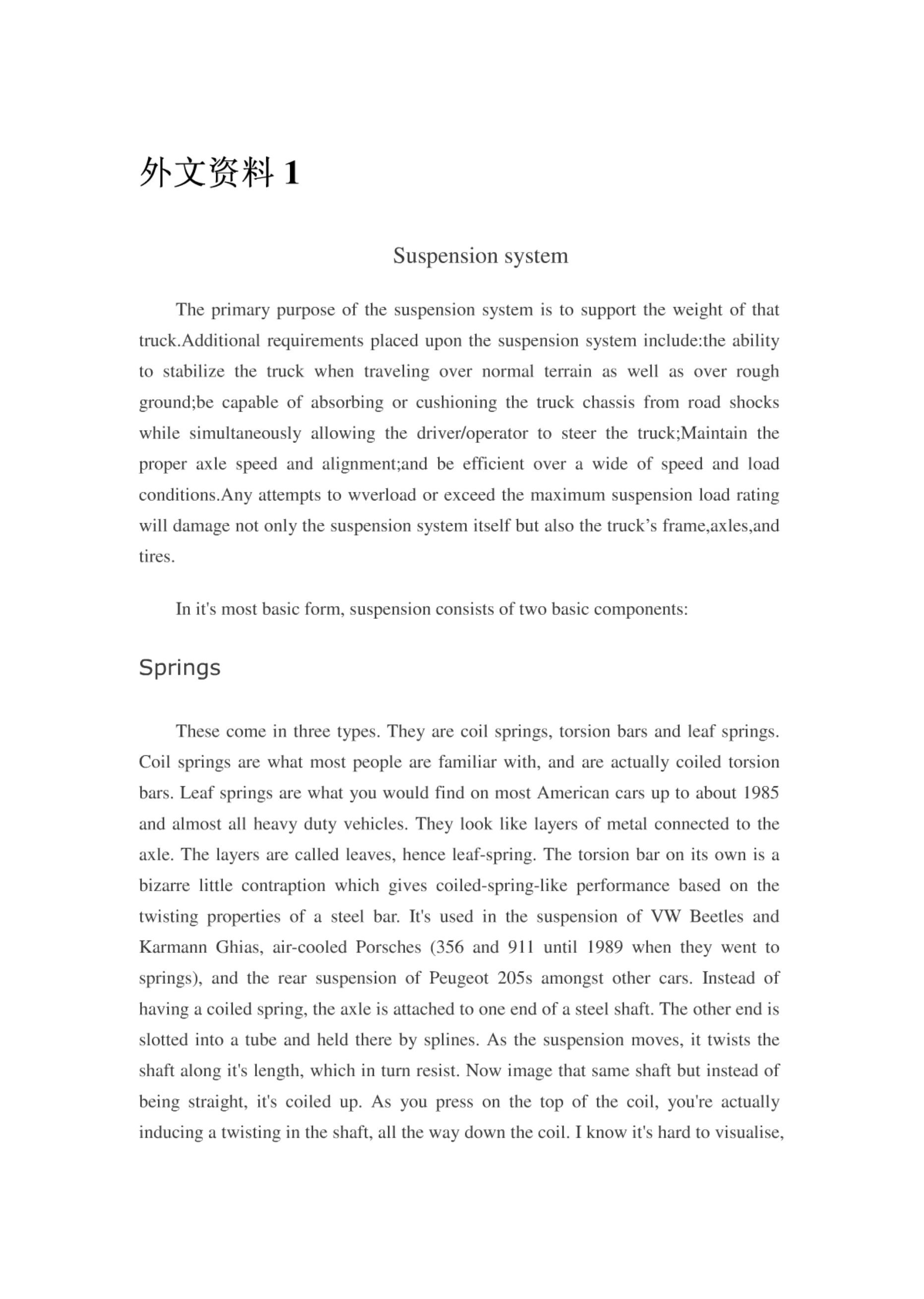 弹簧有三种类型。它们是螺旋弹簧,扭杆和板簧。螺旋弹簧是大多数人熟悉的,实际上是螺旋扭力条。你会在大多数美国轿车直到大约1985年和几乎所有重型车辆发现板簧。他们看起来像是连接在轴上的金属层。这些层称为叶,因此称为叶弹簧。扭力杆本身就是一个奇妙的装置,它给予了杆类似螺旋弹簧的扭转性能。它用于大众甲壳虫,空气冷却的保时捷(356和911直到1989年,当他们去用弹簧),以及标致205s的后悬挂和其他汽车。代替具有螺旋弹簧,所述轴附接到钢轴的一端。另一端是开槽成管并通过花键保持在那里。随着悬架移动,扭杆沿其长度变形,并抵抗这种扭转变形。现在图像相同的轴,而不是是直的,它卷起来。 当你按在线圈的顶部,你实际上在轴中引起扭转,一直沿着线圈向下。我知道很难想象,但相信我,这是确实发生了。下面整个章节都是扭杆和渐进弹簧。