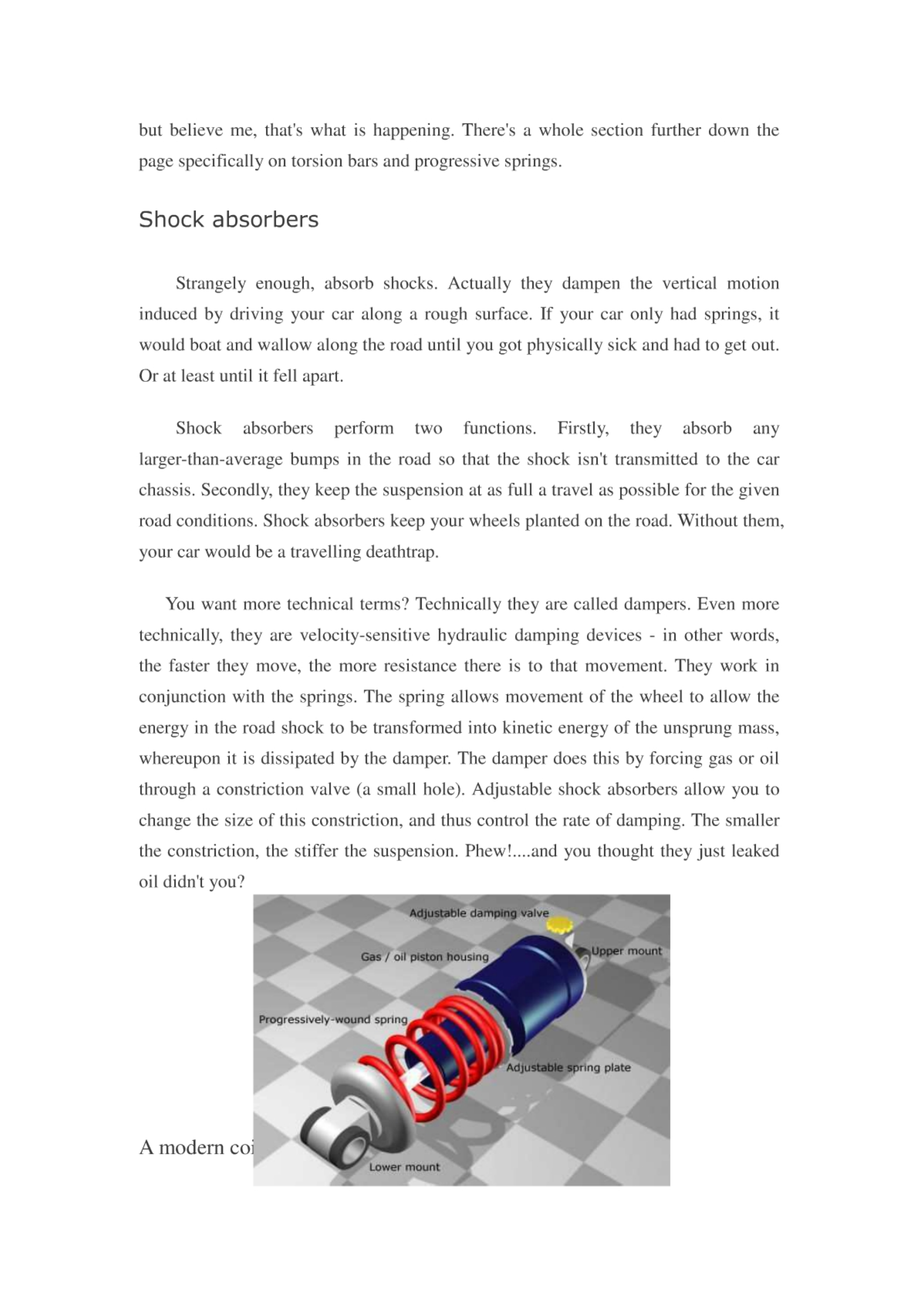 非常奇妙,吸收冲击。 实际上,他们抑制了沿着粗糙的表面驾驶你的汽车引起的垂直运动。 如果你的车只有弹簧,它会沿着道路一直晃动,直到你身体不适,不得不出去。