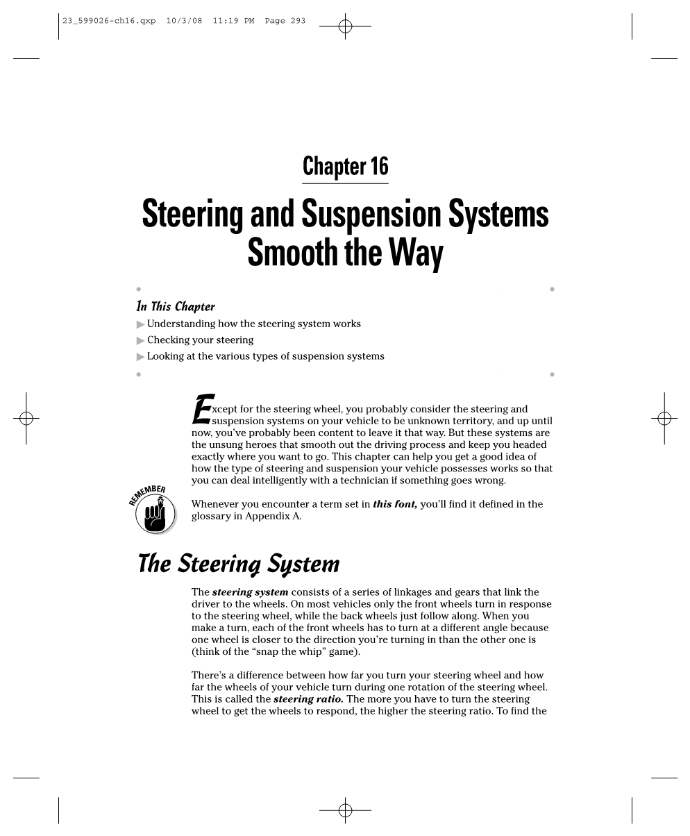 除了转向盘,车辆上的转向系和悬架系统对你来说可能是未知的领域,目前为止你可能觉得这些没有必要了解。但实际上,这些系统是使驾驶过程平顺并使车辆准确按照你的意图前进的必要部件。本章可以帮助你了解车辆所具有的转向系和悬架的类型以及其工作原理,一旦出现问题,您可以和技术人员一起快速地处理。