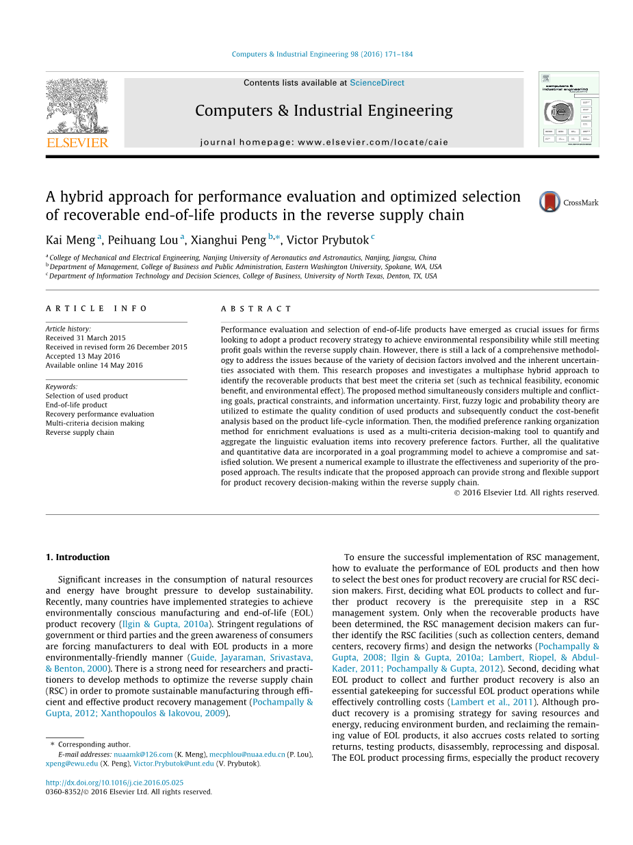 EOL产品,经过全面的文献回顾,我们发现有几个现有研究的空白。首先,以前没有研究如何选择一组约束条件下实现EOL产品优化的解决方案,而大多数以前的研究调查特定类型的产品或如何选择最佳的产品回收。其次,以前一些的研究提供了全面的多准则评价与优化相结合的模型考虑信息模糊的选择,偏好灵活性与目标与约束之间的权衡。第三,大多数以前的研究假设的质量条件和给出了EOL产品的经济方面。他们没有提供估计EOL产品的条件依赖性恢复的细节价值与成本。然而,在实践中,大多数回收公司收到广泛EOL产品不同的模式而不是一种模型,回收企业从产品回收要处理更高附加值的EOL产品的效益最大化问题。此外,估计EOL方法产品条件相关的性能是优化的关键,因为EOL产品状态导致产品回收中的选项中一个大的变化。目前仍然缺乏全面同时考虑多个驱动程序的有效方法,实践约束和EOL产品的不确定性。本研究的目的是为了解决现有的研究差距与学术界对知识的贡献。这个工作提出了一种混合三相的方法进行评估和运用定性和定量相结合的选择EOL产品方法.所提出的方法利用模糊模型性能的多准则决策技术评估,然后寻找一个优化的解决方案,然后使用目标寻找优化的解决方案编程模型。这项研究是第一个发展的研究一种新的混合方法。同时考虑多个驱动程序,实际约束,和EOL产品的不确定性。利用数值进行研究,例如,我们也比较所提出的方法的结果与以开发的方法的结果。数值例子表明所提出的混合动力车的有效性和关于RSC管理产品回收公司法决策,比较支持其优越性。从这项研究中获得的见解也有助于提高行业EOL产品的回收实践从业人员。