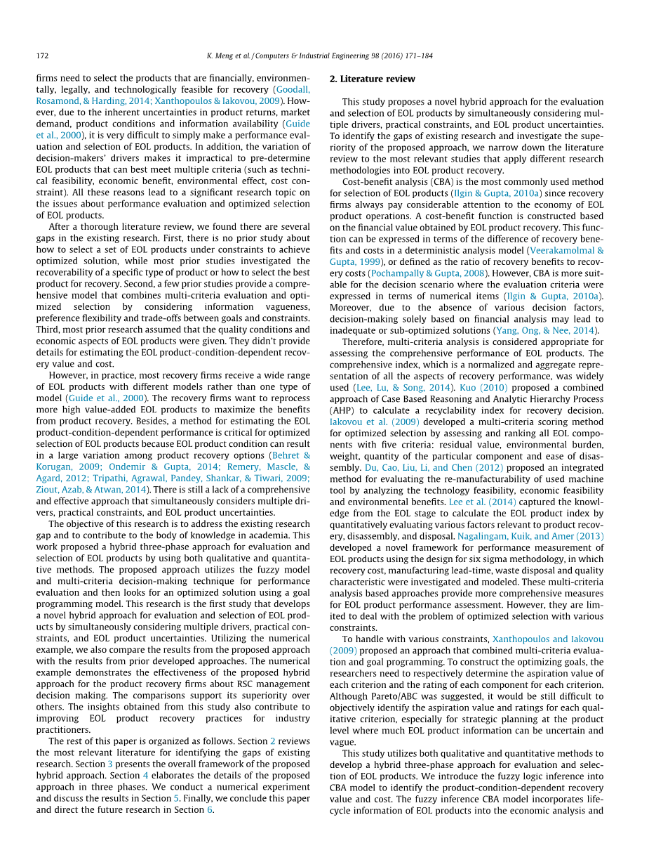 本文的其余部分组织如下。第2节回顾最相关的文献,以确定现有的差距研究。第3节介绍了拟议了总体框架混合方法。第4节详细阐述了拟议的细节三阶段法。我们进行了数值实验并在第5节讨论结果。最后,我们得出结论,本文并指导未来的研究在第6节。2文献综述,本研究提出了一种新颖的混合方法进行评价和选择,同时考虑三个驱动因素,实际的约束,和EOL产品的不确定性。找出现有研究的差距,探讨所提出的方法。我们缩小了文献审查最相关的研究,采用不同的研究方法为EOL产品的回收。成本效益分析(CBA)是最常用的方法,对于EOL产品的选择(依尔金amp; Gupta,2010A自恢复公司始终重视EOL经济产品运营。构建了基于成本效益函数在获得财务价值的废旧产品回收。这个函数可以在回收效益的差异表达—在确定分析模型拟合和成本(veerakamolmal amp;Gupta,1999),或定义为回收效益回收率成本(pochampally amp; Gupta,2008)。然而,CBA更适合决策场景的评价标准在数值的物品表示(依尔金amp; Gupta,2010A)。此外,由于缺乏各种决策因素的情况下,仅仅基于财务分析的决策可能导致不足或次优化的解决方案(杨,Ong,和东东,2014)。因此,多准则分析被认为是适当的EOL产品的综合性能评价方法。这个综合指数,它是一个归一化和集合表示在所有方面的恢复性能,被广泛使用(李,卢,和宋,2014)。Kuo(2010)提出了一种结合基于案例推理和层次分析法(层次分析法)来计算回收回收决策指标。亚科沃等人(2009)制定了多准则评分法通过评估和排名所有EOL组件的优化选择五项标准:残值、环境负荷,重量,数量的特定组件和易于拆卸。杜,曹,刘,黎,和陈(2012)提出了一个综合评价用的机器的制造方法通过分析技术可行性、经济可行性环境效益。Lee et al。(2014)从EOL阶段计算EOL产品的指标,定量评价与产品回收有关的各种因素,拆卸和处置。Nagalingam,Kuik和Amer(2013)开发了一种新的性能测量框架EOL产品,使用六西格玛设计方法,对其中回收成本,制造提前期,废弃物处理和质量特征进行了调查和建模。这些多标准基于分析的方法提供更全面的用于EOL产品性能评价。然而,他们是有限的针对不同的优化选择问题约束。处理各种约束Xanthopoulos和Iakovou(2009)提出了一种结合多准则评价目标规划。构建优化目标研究人员需要分别确定的愿望值每个标准和每个组件的评级为每个标准。