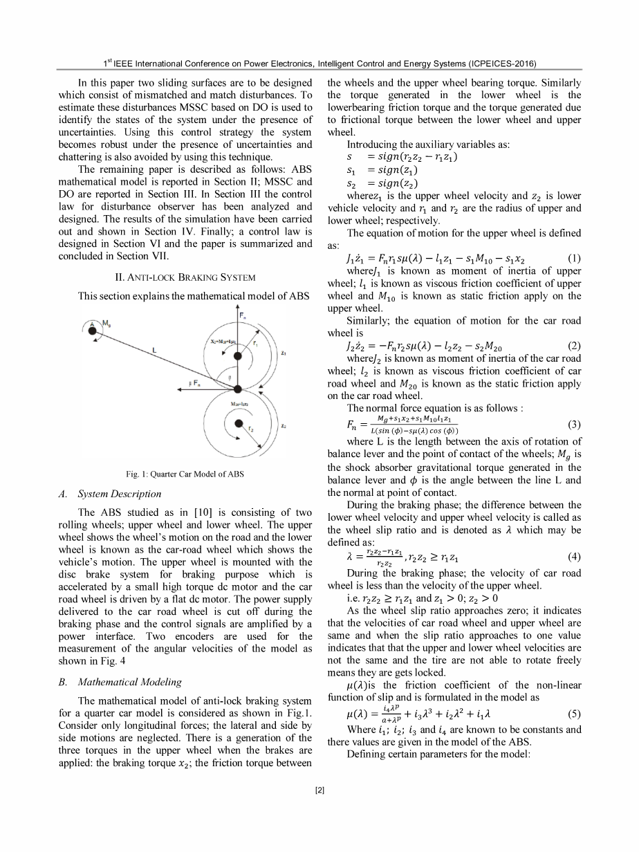 在[8]中,MSS技术已被提出用于失配和不确定的非线性系统来调节制动转矩和车轮滑移。 所提出的控制器与IDC结合以估计干扰和不确定性。 基于多滑动表面控制的扰动观测器(DO)用于估计集中干扰,即:如[9]中所讨论的失配和系统中存在的匹配不确定性。