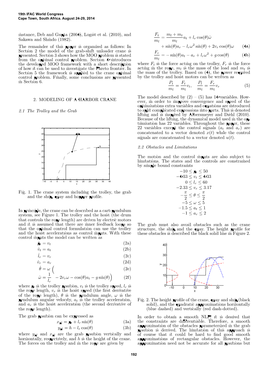 本文的其余部分组织如下:第2节抓斗式卸载起重机的型号是呈现。 第3节显示如何说明MOO问题从最优控制问题。 第4节介绍开发的MOO框架具有简短的描述的如何可以用来调查帕累托边界。 在第5节框架适用于起重机最佳控制问题。 最后,提出了一些结论在第6节。