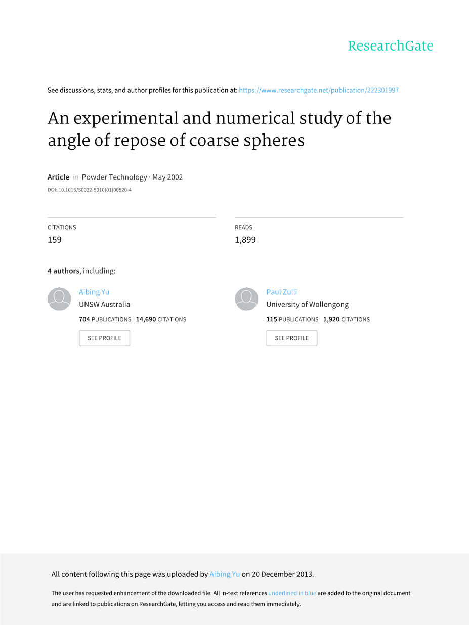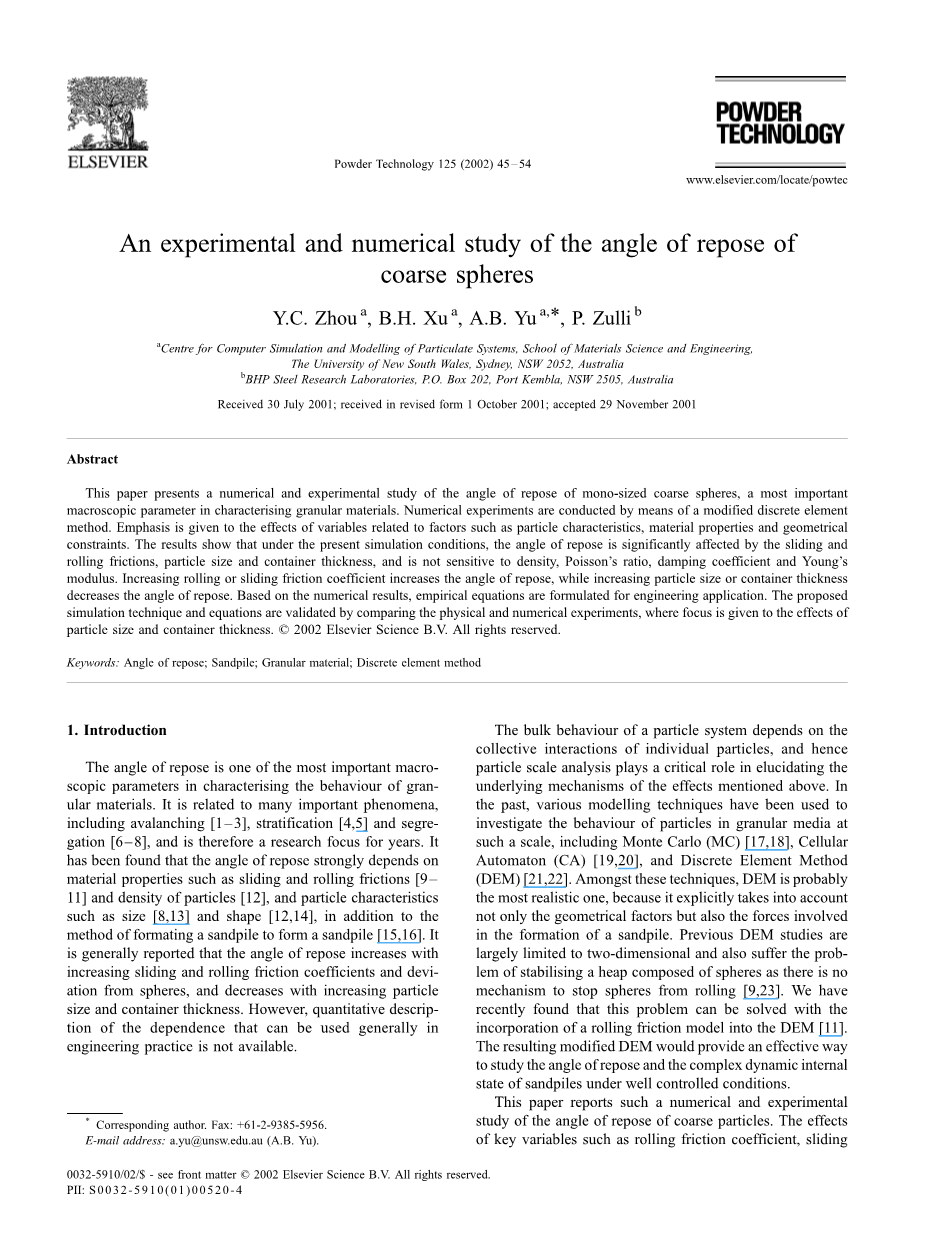 摘要:本文提出了单体大小粗球的休止角的数值和实验研究方法,休止角是表征颗粒物料的最重要的宏观参数。 本文通过改进的离散元件方法进行数值实验。重点是研究颗粒物料休止角与颗粒特性,材料性质和几何约束等因素相关的变量的影响。 结果表明,在本模拟条件下,休止角受到滑动和滚动摩擦力,颗粒尺寸和容器厚度的显着影响,但是密度,泊松比,阻尼系数和杨氏模量对它影响不大。增加滚动或滑动摩擦系数会增加休止角,而增加粒度或容器厚度会减小休止角。 基于数值计算结果,先为工程应用提出了经验方程。 然后通过比较物理和数值实验来验证所提出的模拟技术和方程,其中实验重点是粒子尺寸和容器厚度的影响。