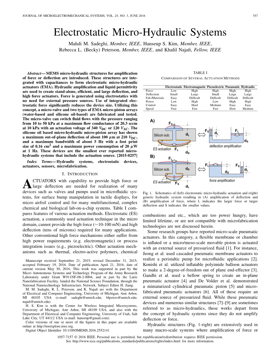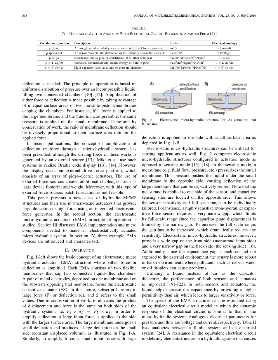本文介绍了一类新型的液压MEMS结构及其在微型执行器中的应用,使用集成的静电力发生器提供大的偏转或大的力。在第二部分,研究了静电微液压致动器(EMA)的运行原理。第三节讨论了制造静电致动微型液压系统所需的EMA和微型部件。在第四部分中,引入和表征了三个示例性的EMA装置