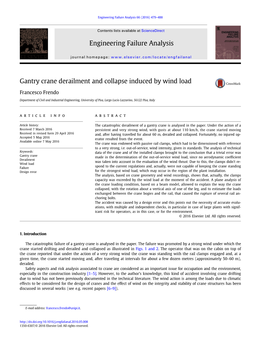 本文对龙门起重机的灾难性故障进行了分析。失败是由强风推动下,起重机开始漂移和脱轨和倒塌,如图1和图2所示。操作员在起重机顶部的小屋的报道,一个非常强大的风鹤站在夹轨器配合作用下,在给定的时间内,起重机开始移动,行驶间隔约几十米后(约50–60米),出轨。