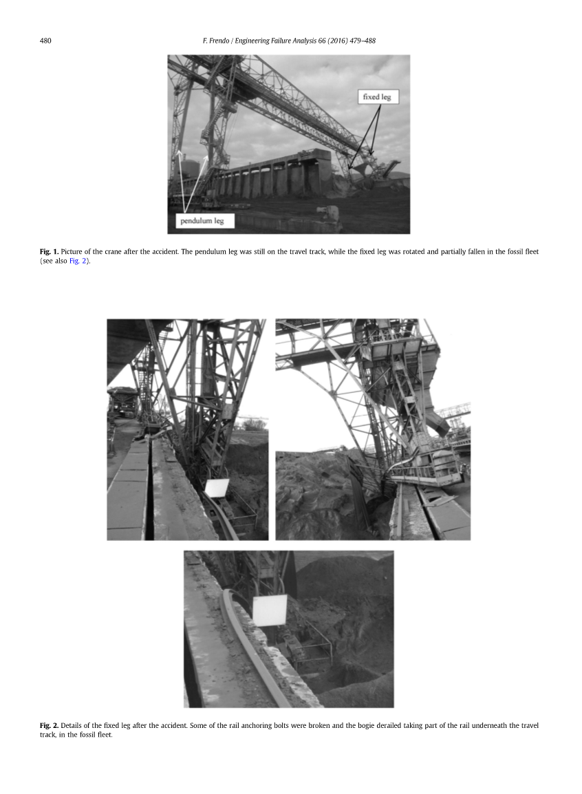bull;摆腿保持与转向架上的行驶轨迹(图1),而在另一边,固定腿逆时针旋转在顶视图和出轨,后部分的螺栓锚固钢轨断裂(图2);因此,一些起重机的结构倒塌;