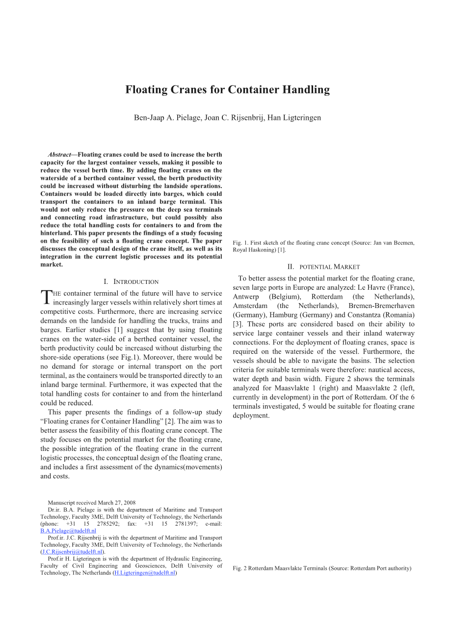 未来的集装箱码头必须以有竞争力的价格在相对较短的时间里服务越来越大的船只。而且在处理斜坡上的卡车,火车,驳船的要求上也有了越来越多的标准。早期的研究表明通过在停靠集装箱船的水边使用浮式起重机,泊位生产力将会在不影响岸上运作的前提下提升。集装箱将会被直接运输到内陆驳船码头而对于港口码头不会有存储或内部运输的要求(如图1所示)。此外,集装箱运抵及运离腹地的总体花费预期将会减少。这篇文章展示了对集装箱装卸用浮吊跟踪调查的结果。目的是更好地评估浮式起重机概念的可行性。这个课题重点研究了浮式起重机的潜在市场,浮吊在当前物流市场可能的集成过程,浮吊的概念设计以及包括对动态和花费的第一次评估。