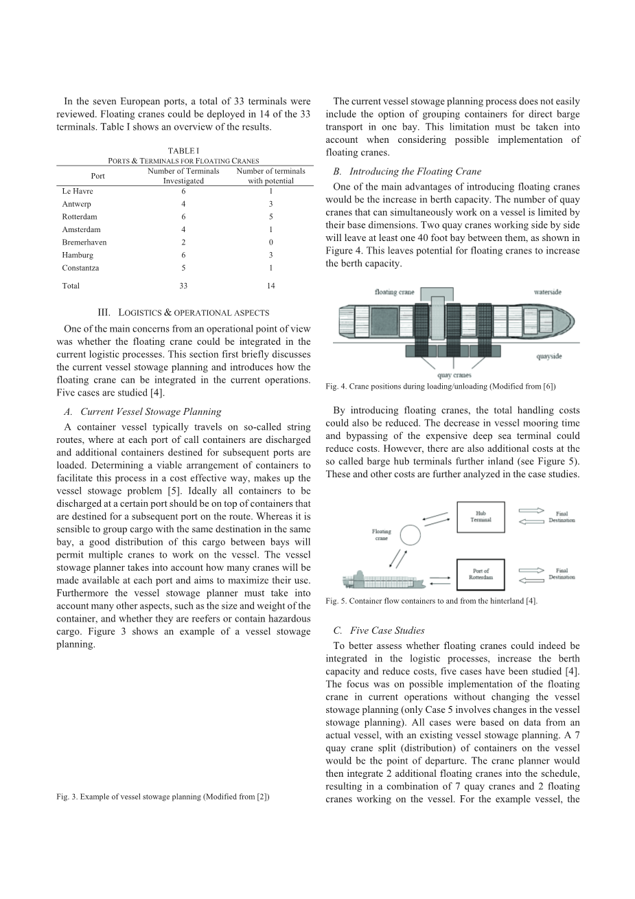 可操作的观点中其中一个主要的概念就是是否浮式起重机能集成在现代的物流进程中。这个部分首先简短的讨论了现代船舶配载计划和介绍了浮式起重机如何集成在目前的运作中。这里对5个案例进行了研究。