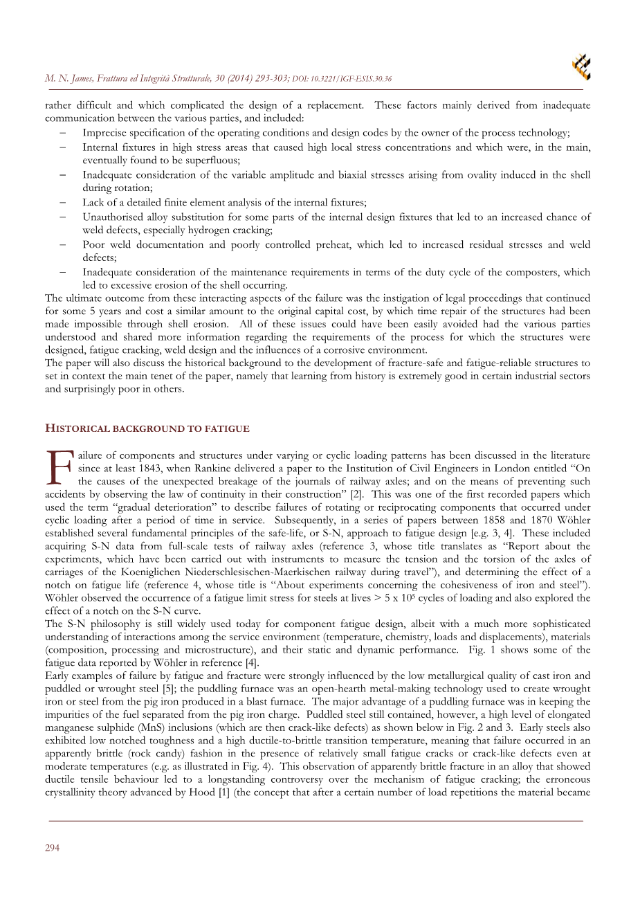 在疲劳这个词第一次被创造了170年之后也是在进行了第一次全面的结构疲劳试验进行150年之后,许多大型且昂贵的结构与其设计的疲劳寿命相比仍然会出现过早的断裂。本文将探讨那些名义上经过精心设计和制造的结构为什么仍然会出现这些情况的一些原因,并得出要从中学习的经验教训以及如何将这些教训传播给工程师的结论。作为主要例子,将用两个大型旋转外壳,其替代资本成本约为2000万美元,这些外壳本来设计的是提供20年的使用寿命,结果在开始使用的5-7个月内发生了严重的壳体断裂。