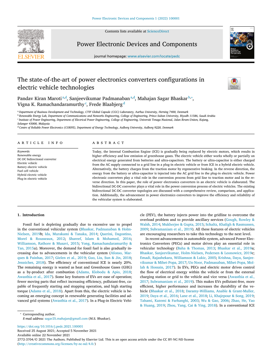今天,内燃机(ICE)正逐渐被电动机所取代,这导致了更高的能源效率和低温室气体排放。电动汽车全部或部分依靠电池和超级电容器产生的电能工作。在插电式电动汽车中,电池或超级电容器由连接到电网线路的交流电源充电,在混合动力电动汽车中由内燃机充电。另外,电池通过再生制动从牵引电机充电。在相反的方向,电池或超级电容器的能量被注入插电式电动汽车的交流电网线路。电力电子转换器在从电网线到牵引电机的转换过程中以及在逆向中发挥了重要作用。在本文中,阐述了电力电子转换器在电动汽车中的作用。双向DC-DC转换器在电动汽车的电 力转换过程中起着重要作用。对现有的双向DC-DC转换器拓扑结构进行了全面的回顾、比较和应用。此外,还阐述了电力电子转换器的进步,以提高车辆系统的效率和可靠性。