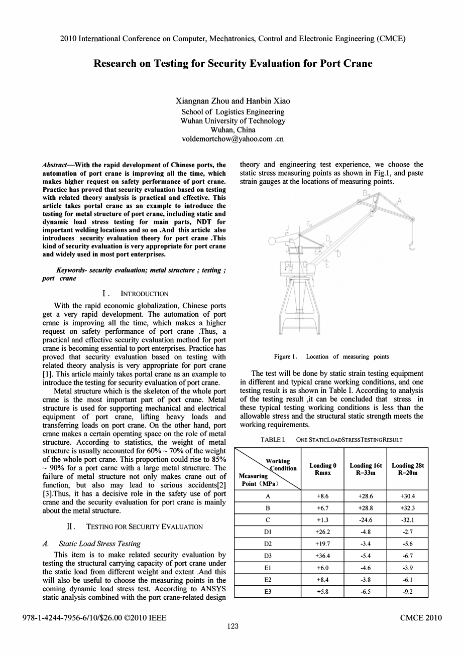 [1] H. Shan G. Liu,《基于测试和计算的起重机的安全评价和应用》,武汉理工大学学报,第25卷,第10期,第74-76页,2003年10月。