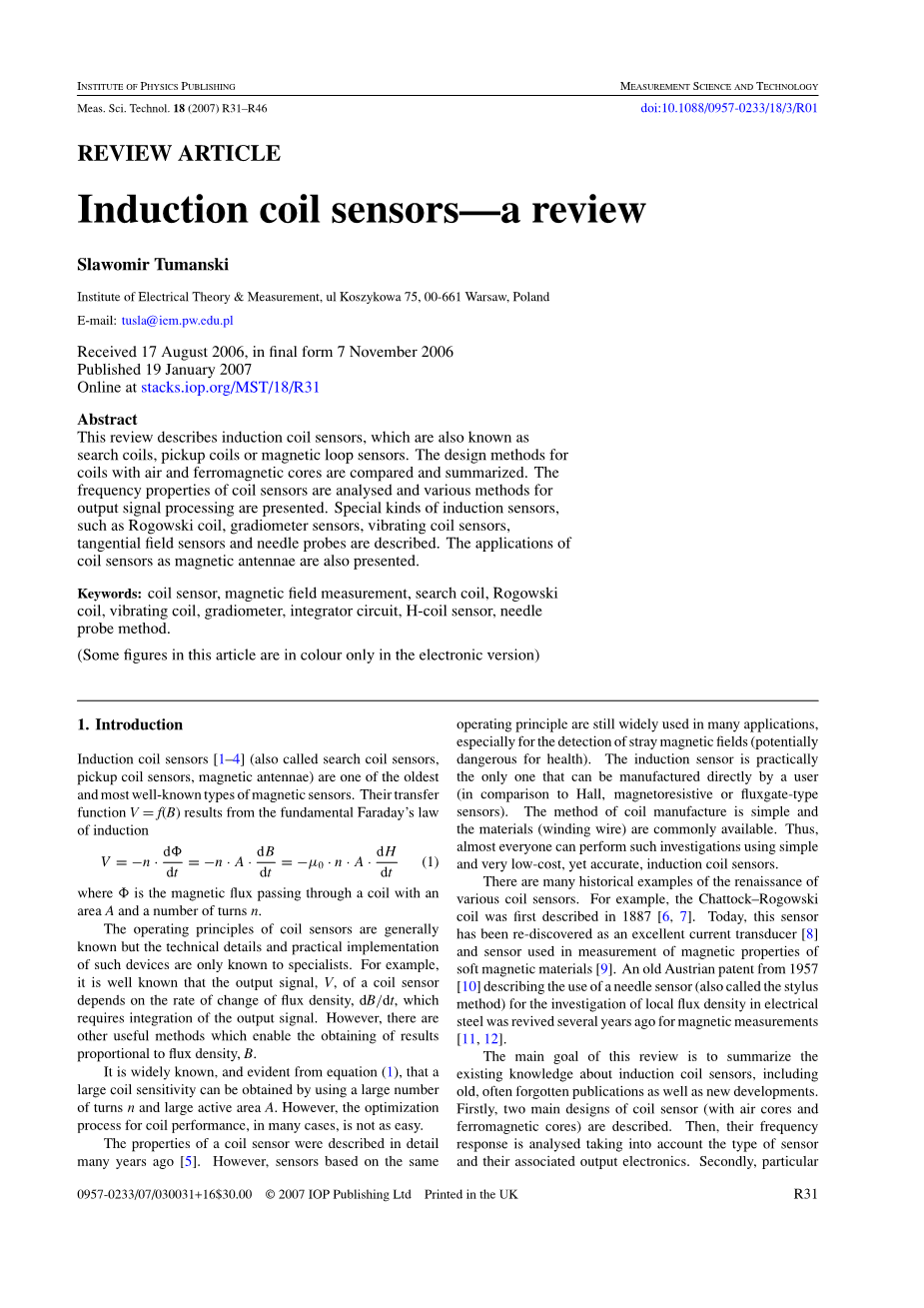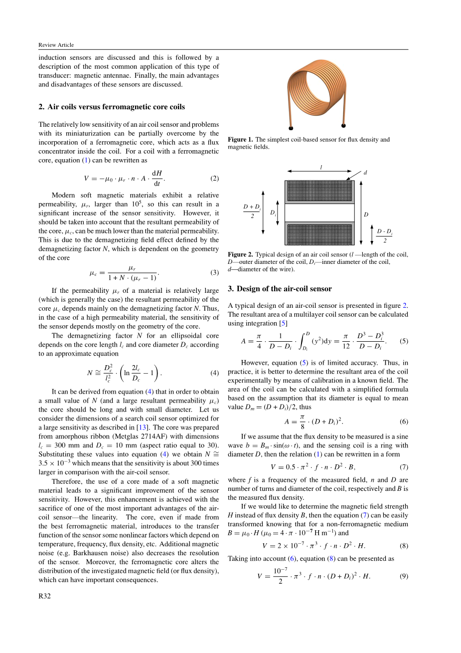 该评述描述了感应线圈传感器,其也被称为探测线圈,拾波线圈或磁环传感器。具有空气和铁磁芯的线圈的设计方法是比较和总结。分析了线圈传感器的频率特性并且用了各种方法对输出信号进行了处理。特殊种类的感应传感器,例如罗柯夫斯基线圈,梯度计传感器,振动线圈传感器,切向场传感器和针探针。还提出了线圈传感器作为磁性天线的应用。