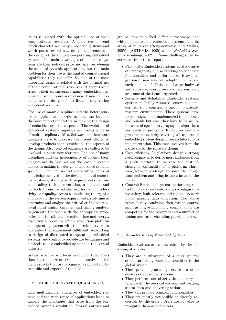 由于嵌入式系统的变革,其多学科的特性和广泛的应用性导致其面临着许多的问题。一些实体和集团已经发布了有关嵌入式系统和其应用领域的白皮书(Bouyssounouse and Sifakis, 2005, ARTEMIS, 2005,Embedded Systems Roadmap, 2002)。我们可从这些报告中提取出一些关键点。