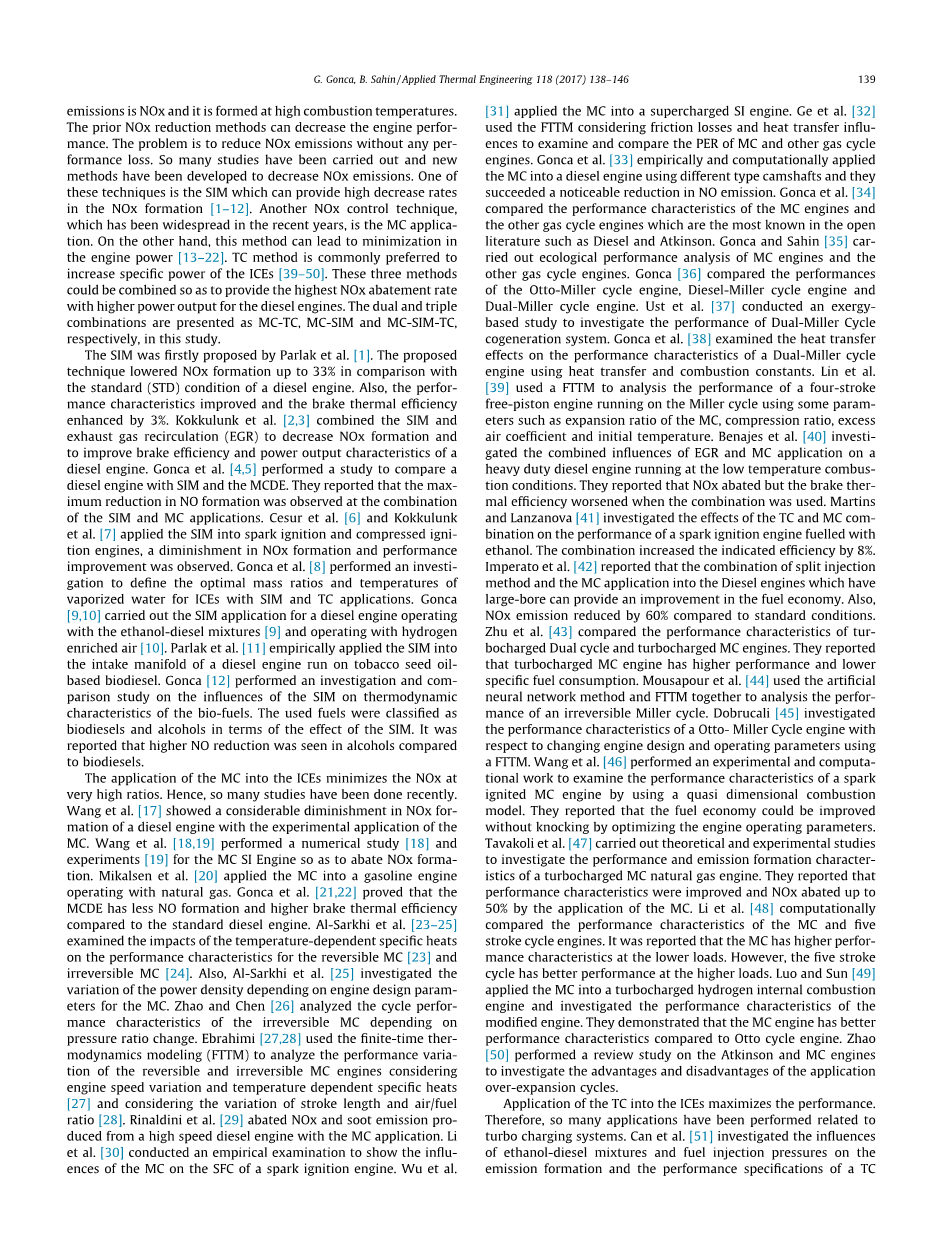 MC在ICE中的应用以非常高的比例将NOx最小化。因此,最近已经做了很多研究。 Wang等[17]在MC的实验应用中,柴油发动机的NOx排放显着减少。 Wang等[18,19]对MC SI Engine进行了数值研究[18]和实验[19],以减少NOx形成。 Mikalsen等人[20]将MC应用于用天然气运行的汽油发动机。 Gonca等人[21,22]证明,与标准柴油发动机相比,MCDE具有较少的NO形成和较高的制动热效率。 Al-Sarkhi et al。 [23-25]研究了温度依赖性比热对可逆MC [23]和不可逆MC [24]的性能特征的影响。此外,Al-Sarkhi等人[25]根据MC的发动机设计参数研究功率密度的变化。 Zhao和Chen [26]根据压力比变化分析了不可逆MC的循环性能特征。 Ebrahimi [27,28]使用有限时间热力学建模(FTTM)来分析可逆和不可逆的MC发动机的性能变化,考虑发动机转速变化和温度依赖比热[27],并考虑中风的变化长度和空气/燃料比[28]。 Rinaldini等[29]减轻了使用MC应用的高速柴油发动机产生的NOx和烟尘排放。 Li et al。 [30]进行了实证检查,以显示MC对火花点火发动机SFC的影响。