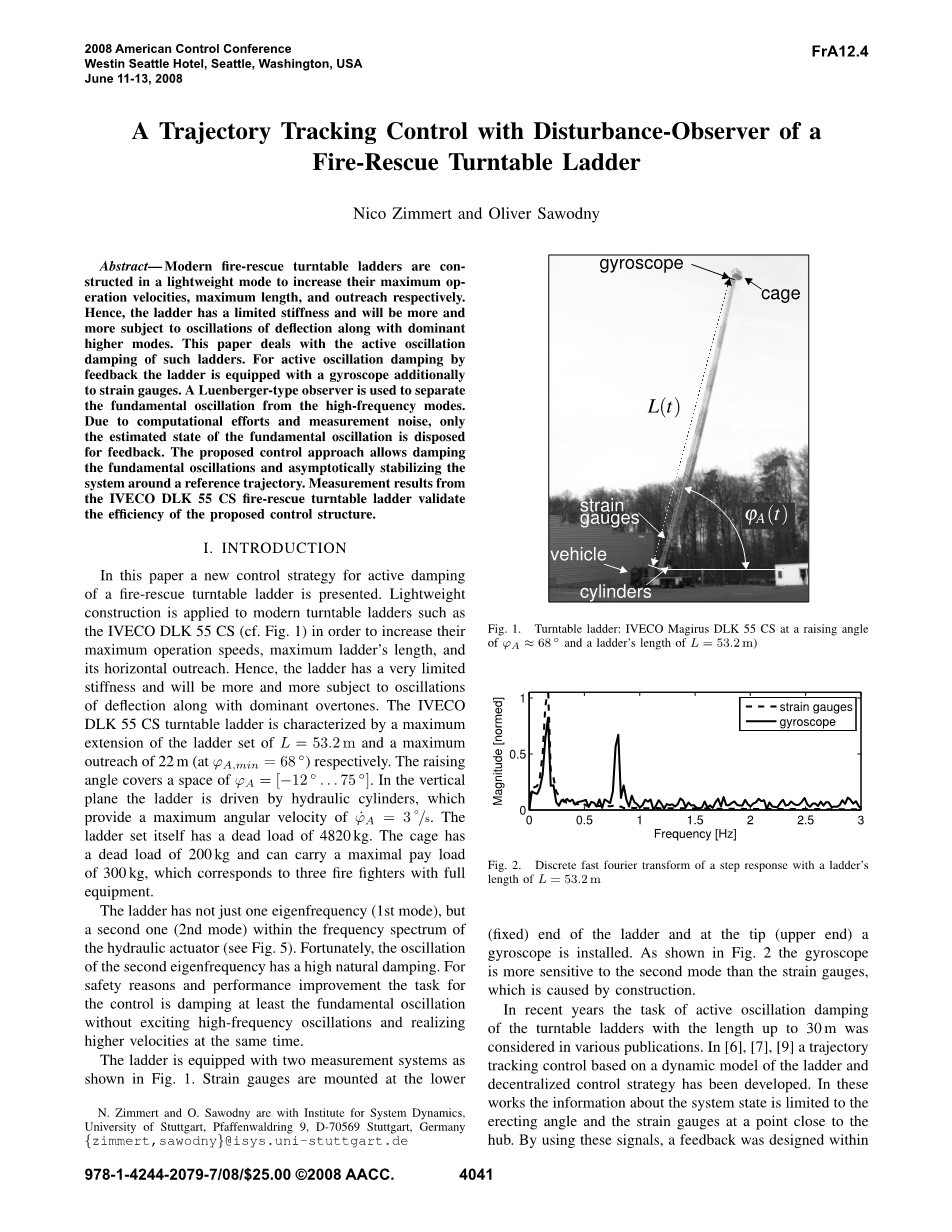 摘要:轻型结构被用于现代消防救援云梯以分别提高其最大运行速度、最大长度和外伸距离。因此,梯架的刚度受限制并且更易受到偏转时高频震荡的影响。本文讨论的转台云梯的主动减震。为反馈云梯震荡降低效果使用了陀螺仪和应变器。使用Luenberger型观察器将基波震荡从高频震荡分离出来。由于计算工作量和测量噪声,仅仅将基波震荡的估计状态用于反馈。提出的控制方案将降低云梯的基波震荡并逐渐稳定参考轨迹的系统,从IVECO DLK 55 CS消防救援云梯的测试结果验证了所提控制结构的效率。