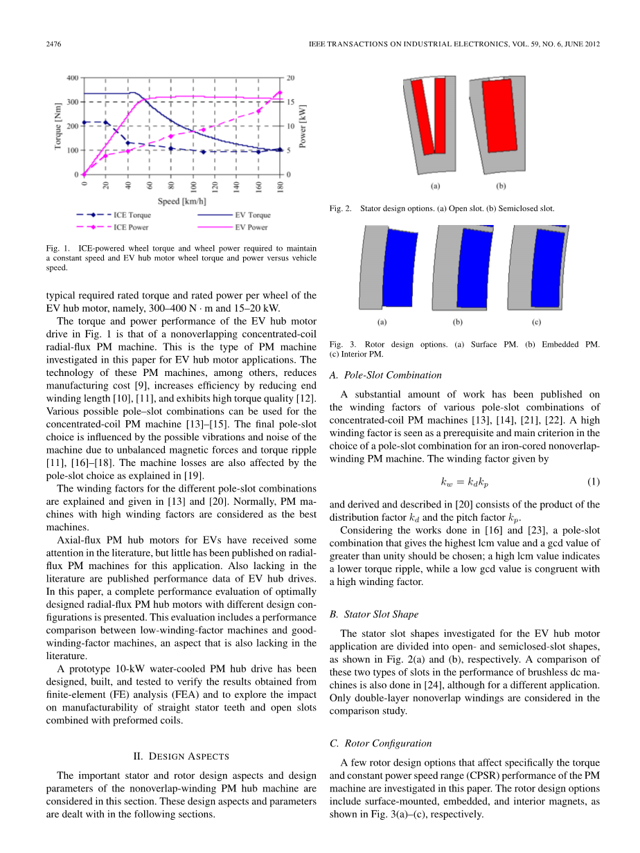 图1中电动汽车轮毂电机驱动的转矩与功率性能来自具有径向磁通的非叠集中绕组永磁电机。这是本文中研究的用于电动汽车轮毂电机应用的永磁电机的类型。这些永磁电机的应用,减少了制造成本[9],通过减少端部绕组长度提高了效率[10][11],并展现出了高的转矩能力[12]。各种可能的极槽组合,都能被用于集中绕组永磁电机上[13]-[15]。由于不平衡的磁力和转矩波动,电机可能产生的振动和噪声,这影响着最终极槽的选择[11][16]-[18].如参考文献[19]所解释的那样,电机的损耗也被极槽的选择所影响。