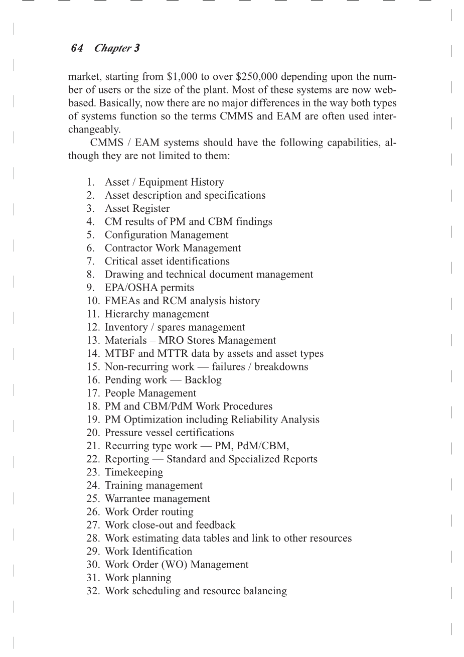 其他类型的系统是独立的应用程序相关的维护管理。他们可以与其他企业的系统,如金融或人力资源系统接口。这种系统称为计算机化维护管理系统(CMMS)。CMMS的名字在上世纪70年代末80年代创造和PM程序用电脑自动新的CMMS系统有更多的能力和功能;他们更容易使用比一些EAM系统。这些系统的例子是assetpoint,冠军,数据流,emaint,EPEC、Ivara、Maximo / IBM、Mapcon、冲击、和协作/ SPL /甲骨文的WAM。超过一百个系统可在市场上,从$ 1000至超过$ 250000取决于用户数量或工厂的规模。大多数这些系统现在网络。基本上,现在没有大的区别的两种系统功能方面CMMS和EAM往往交替使用。
