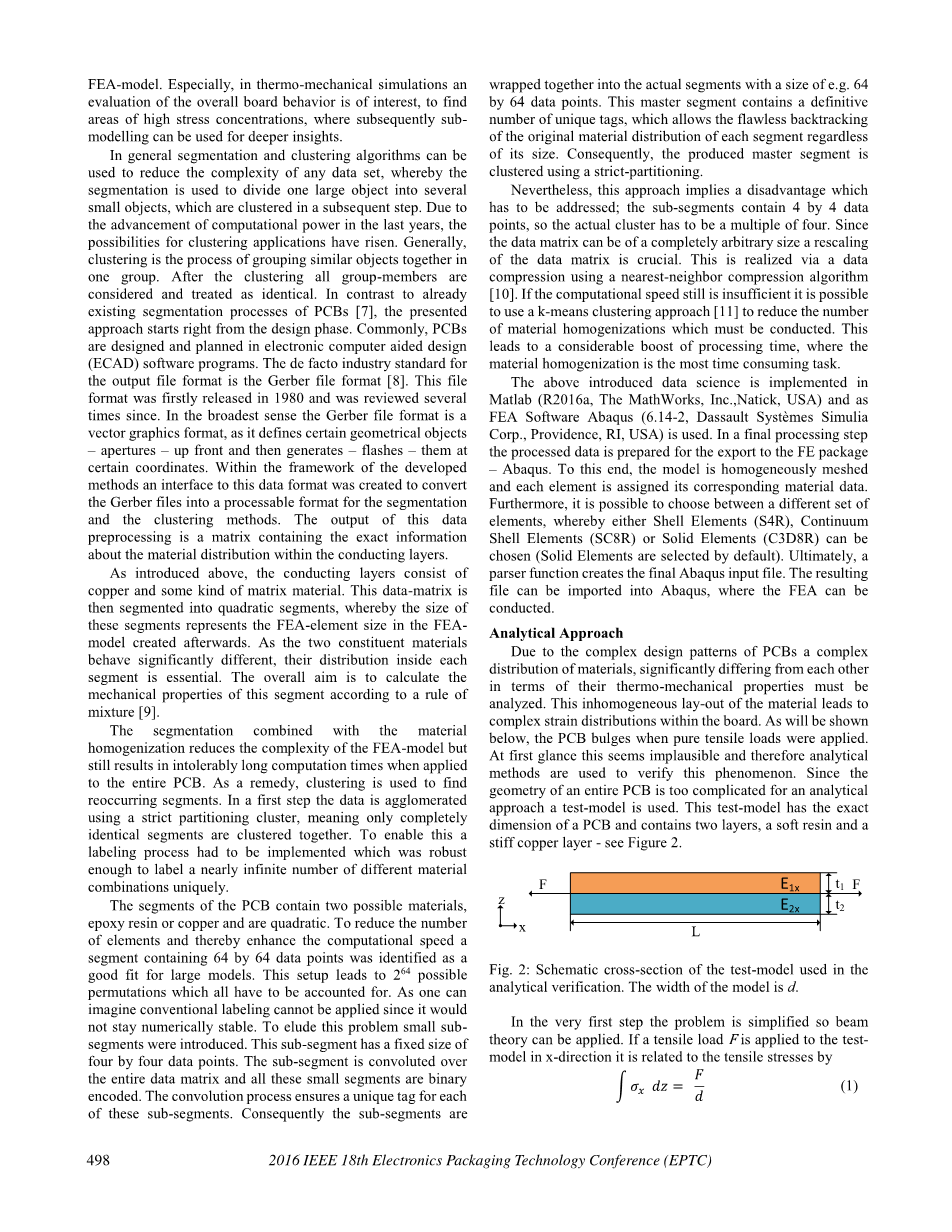 然而,这种方法意味着缺点必须解决; 子段包含4乘4数据点,所以实际的集群必须是四的倍数。 以来数据矩阵可以具有完全任意的大小重新缩放的数据矩阵是至关重要的。 这是通过数据实现的使用最近邻压缩算法进行压缩[10]。 热机械模拟中评估整体板的行为是令人感兴趣的,找到高应力集中区域,其中随后的子建模可用于更深入的洞察。作为两种组成材料行为显着不同,它们在每个内部的分布段是必不可少的,如果计算速度仍然不够,则是可能的使用k均值聚类方法[11]来减少数量的必须进行的材料均匀化。 此数据的输出预处理是一个包含确切信息的矩阵关于导电层中的材料分布。如上所述,导电层由铜和某种基质材料。这个导致处理时间的显着增加,其中材料均匀化是最耗时的任务。上面介绍的数据科学是在中实现的Matlab(R2016a,The MathWorks,Inc.,Natick,USA)和as