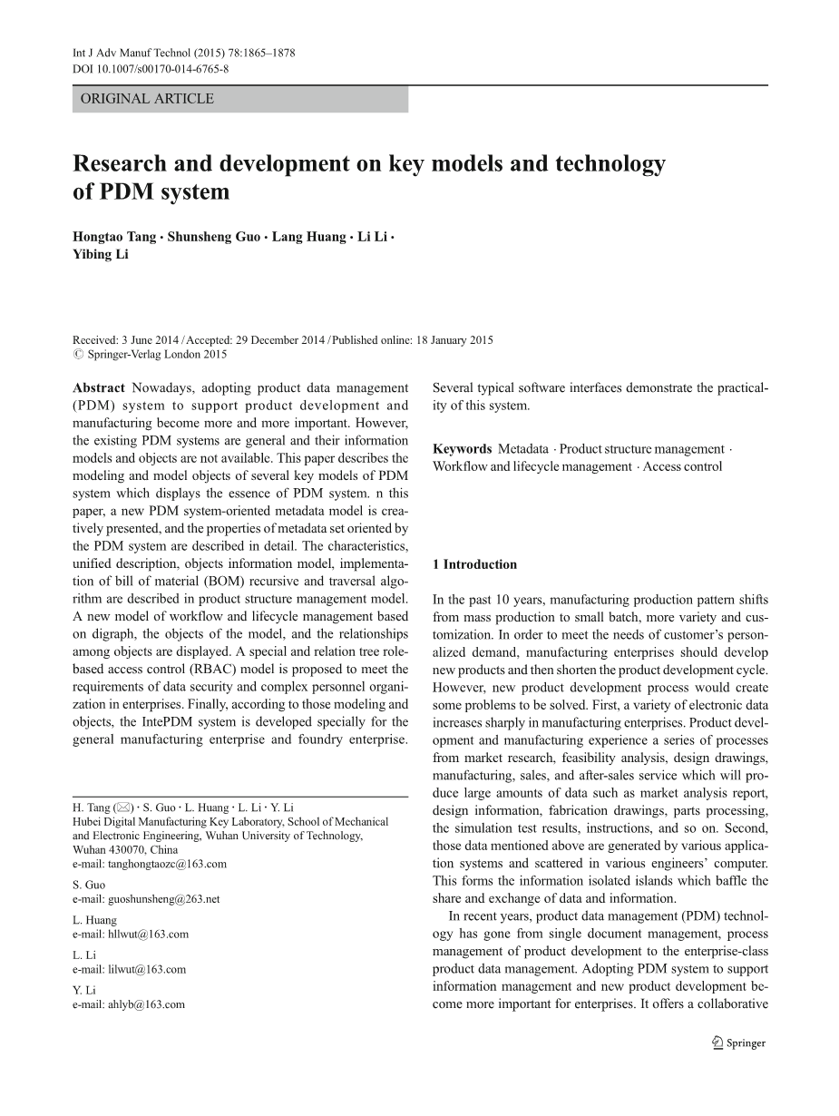 摘要:如今,采用产品数据管理(PDM)系统来支持产品开发和制造变得越来越重要。然而,现有的PDM系统面对一般的及其信息模型和对象不能用。本文介绍了PDM的几个关键模型的建模和模型对象系统显示PDM系统的本质。这篇文章创新地呈现了一种新的面向PDM系统的元数据模型,以及元数据集的属性详细描述PDM系统。特点,在产品结构管理模型中描述了统一描述,对象信息模型,物料清单实施(BOM)递归和遍历算法。基于工作流和生命周期管理的新模型,在图上,模型的对象和关系显示对象。提出了一种特殊和关系树基于角色的访问控制(RBAC)模型来满足企业数据安全要求和复杂人事组织要求。最后,根据那些造型和对象,IntePDM系统是专门为一般制造企业和铸造企业开发的。几个典型的软件界面说明了该系统的实用性。
