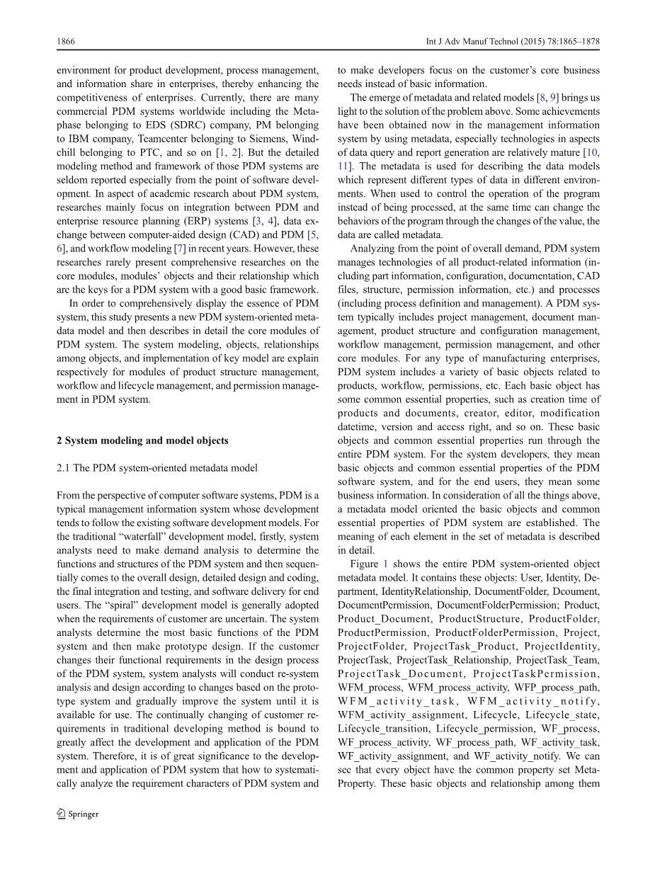 近年来,产品数据管理(PDM)技术已经从单一的文档管理,流程化过程产品开发管理到企业级产品数据管理。 采用PDM系统支持信息管理和新产品开发对企业更为重要。为企业的产品开发,流程管理和信息共享提供了一个协同的环境,从而提高了企业的竞争力。目前有很多全球商业PDM系统,包括属于EDS(SDRC)公司的PM,属于PM到IBM公司,属于西门子的Teamcenter,属于PTC的Windchill等[1,2]。但是PDM系统的详细建模方法和框架很少从软件开发的角度出发。 在PDM系统的学术研究方面,研究主要集中在PDM与企业资源规划(ERP)系统之间的集成[3,4],计算机辅助设计(CAD)和PDM [5,6]之间的数据交换以及工作流程 近年来建模[7]。 然而,这些研究很少对核心模块,模块对象及其关系进行综合研究,这是具有良好基本框架的PDM系统的关键。为了全面展示PDM系统的本质,本研究提出了一种新的PDM面向系统的元数据模型,然后详细介绍了PDM系统的核心模块。 系统建模,对象,对象之间的关系和关键模型的实现分别解释了产品结构管理,工作流程和生命周期管理以及PDM系统中的权限管理模块。