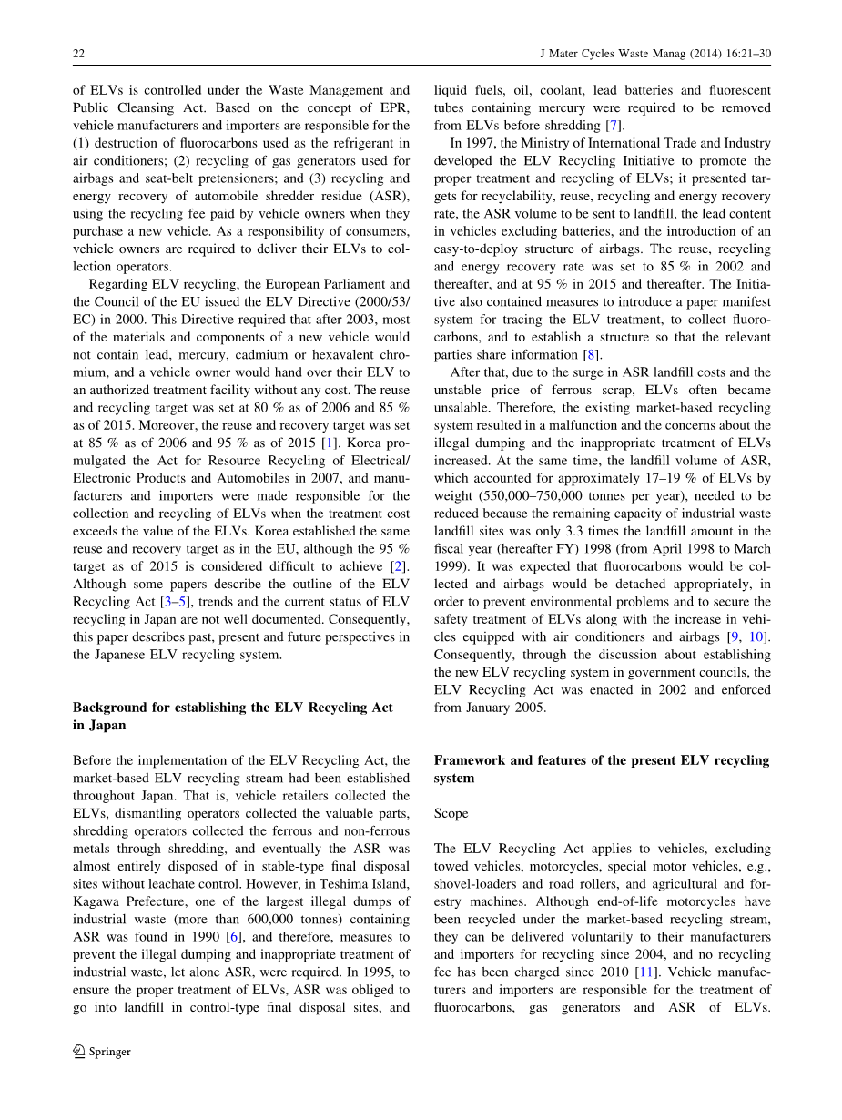 在日本,1993年颁布了《基本环境法》;这定义了环境保护政策的基本原则和基础。根据该法案,2000年颁布了《健全的物质循环型社会基本法》。一个健全的物质循环社会是一个减少自然资源消耗的社会,通过减少,循环使用和妥善处置废物,尽可能减少对环境的影响。健全的物质循环型社会的一个基本原则是,处理好资源重复利用和能量回收这些循环资源的优先级,并且最终适当地处理不适合循环使用的那些资源。此外,还规定了经营者的两项职责:(1)承担对自身排出的不适合循环使用的废物进行适当处置的责任;(2)扩大生产者责任(EPR),生产者采取必要措施促进废物的减少,再利用和再循环,以及尽量减少妥善处理他们所生产的废物的困难。同时,消费者有责任在商业经营者实施过程中进行合作,例如,将废物移交给他们。根据这些基本法案,实施废物管理和公众清洁法,用于城市和工业废物的无害环境管理,并且为废物收集者、运输者、处理经营者和废物处理设备制定许可证。为了妥善处理和有效利用报废车辆(ELV),《报废汽车回收法》在2005年生效。虽然报废汽车通常是有价值的,但根据《报废汽车回收法》的规定,它们被视为废物,因此 报废汽车是根据《废物管理和公共清洁法》处理的。基于夸大生产者责任的概念,通过使用车主购买新车时缴纳的再循环费,车辆制造商和进口商有责任(1)销毁用作空调制冷剂的碳氟化合物;(2)收回安全气囊气体发生器和安全带预紧器;(3)汽车粉碎残渣(ASR)的回收和能量回收。作为消费者,车主有责任向报废汽车收集经营者交付其报废汽车。