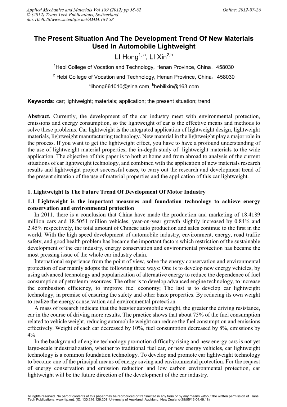 摘要:目前,汽车行业的发展需要满足环境保护,尾气排放和能源消耗的标准,因此轻量化汽车是解决这些问题的有效手段和方法。汽车轻量化是轻量化设计,轻量化材料,轻量化制造科学技术的综合应用。新材料在轻量化过程中起到了重要的作用。如果你想获得轻量级的效果,你必须深刻地了解轻质材料的使用性质,深入研究轻质材料的广泛应用。这篇文章的目的是对国内国外的汽车轻量化技术进行现状分析,并且结合新材料研究结果的应用和轻量化项目成功的案例,开展研究目前汽车使用的材料的性能的状况和应用于汽车轻量化材料的发展的趋势。