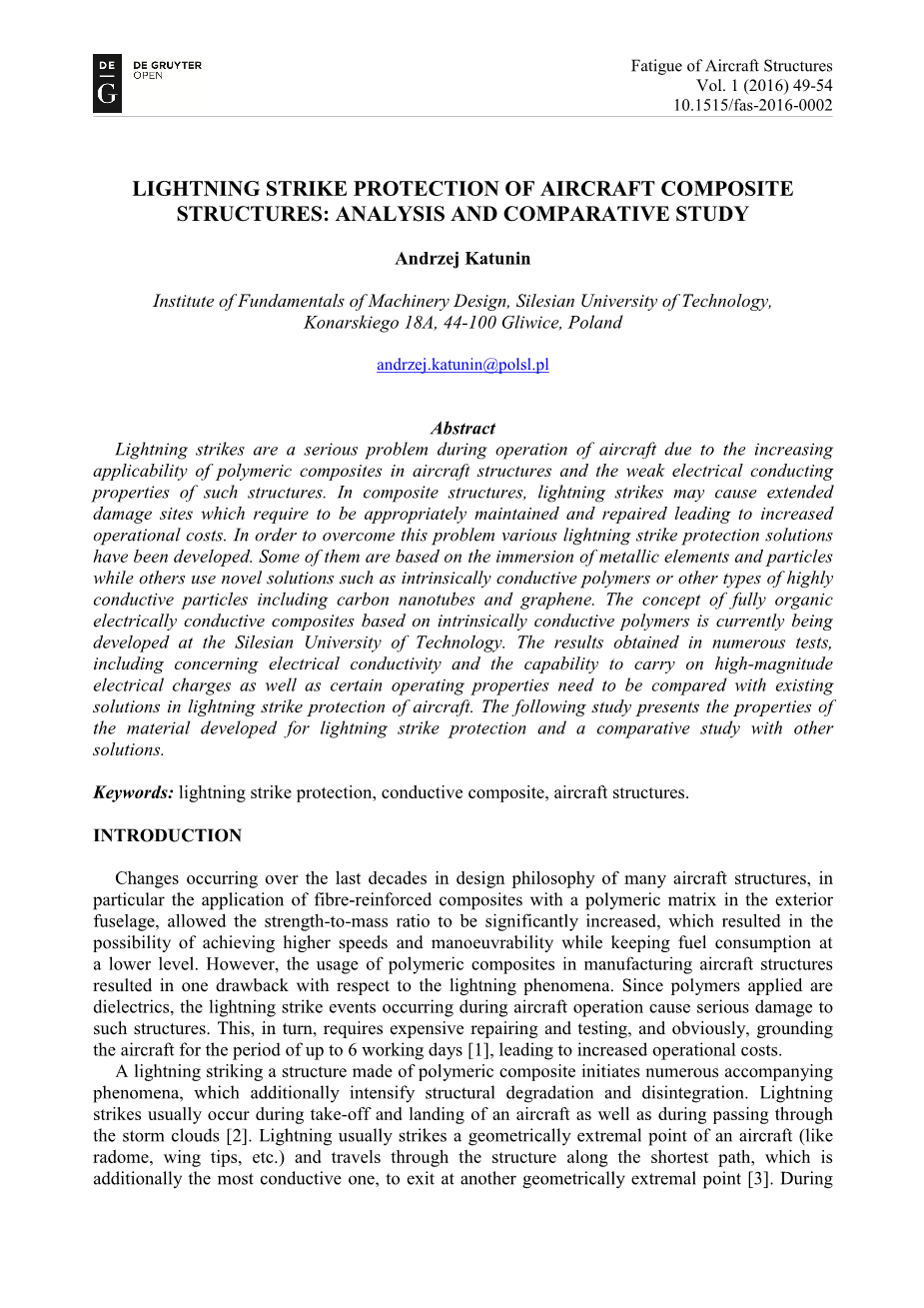 在过去几十年中,许多飞机结构的设计理念发生了变化,特别是在机身外部应用了具有聚合物基体的纤维增强复合材料,从而使强度与质量比显著提高,这使得在保持较低的燃料消耗水平的同时达到更高的速度和操纵性的可能性。然而,在制造飞机结构时使用聚合复合材料造成了一个缺点。就闪电现象而言,由于所应用的聚合物是介质,在飞机运行过程中发生的雷击事件会对这种结构造成严重的破坏,这反过来又需要昂贵的修理和测试,显然,使飞机搁浅。由于所使用的聚合物是介电材料,在飞机运行期间发生的雷击事件对这种结构造成严重损害,这反过来又需要昂贵的维修和测试,显然,使飞机停飞长达6个工作日[1],导致运营费用增加。