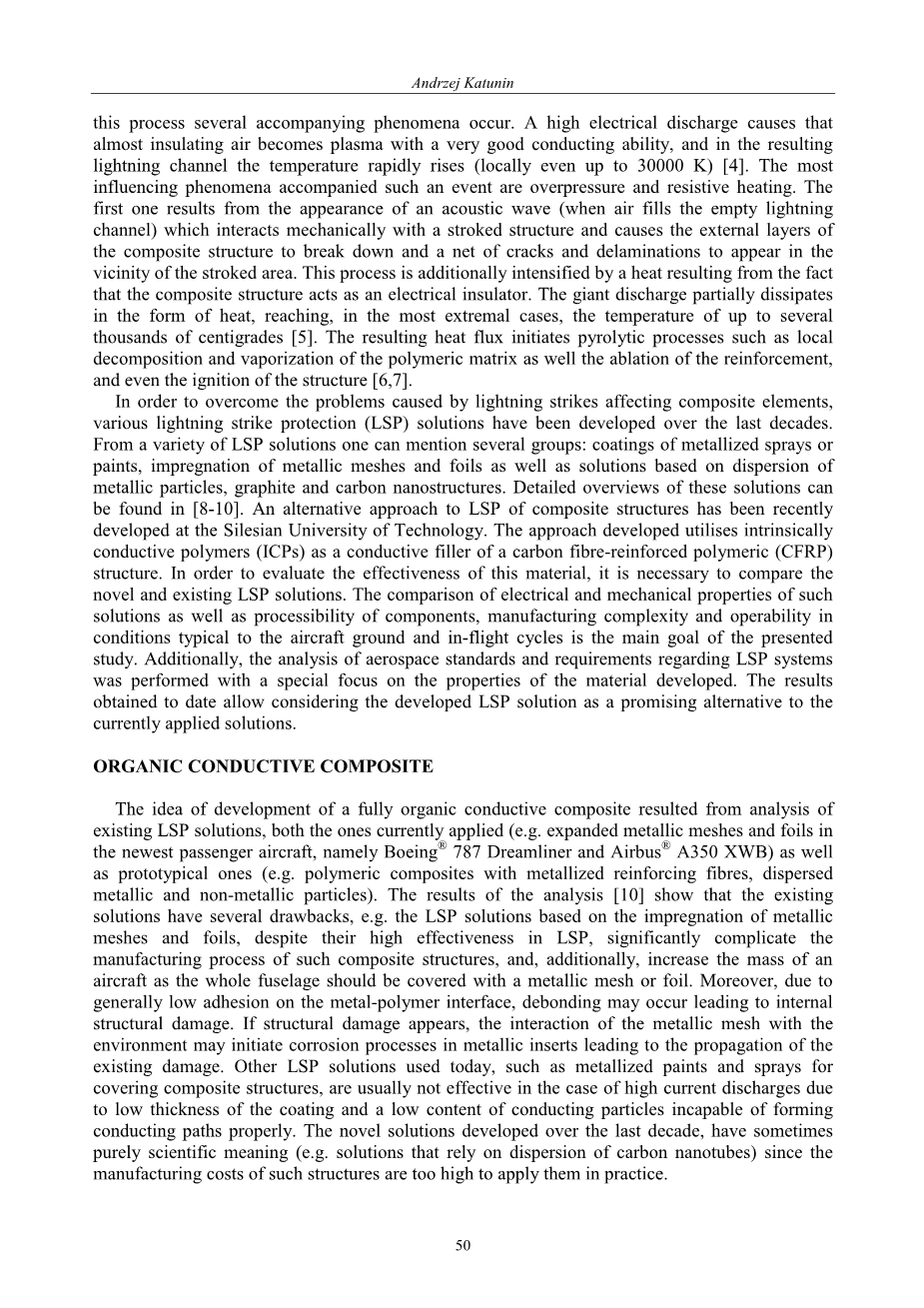 由于聚合物复合材料在飞机结构中的适用性越来越强,而且这种结构的导电性能较弱,因此雷击是飞机运行中的一个严重问题。在复合结构中,雷击可能造成需要适当维护和修复的长期损坏场地,从而增加运营成本。为了克服这一问题,人们提出了各种雷击保护的解决方案。其中一些是基于金属元素和粒子的浸没,而另一些则使用新颖的解决方案,如天然导电聚合物或其他类型的高导电粒子,包括碳纳米管和石墨烯。西里西亚技术大学目前正在开发基于本征导电聚合物的全有机导电复合材料的概念。在大量的试验中,包括导电率、承受高强度电荷的能力以及某些工作性能需要与现有的航空防雷解决方案进行比较。下面的研究介绍了所研制的防雷材料的性能,并与其他溶液进行了比较研究。
