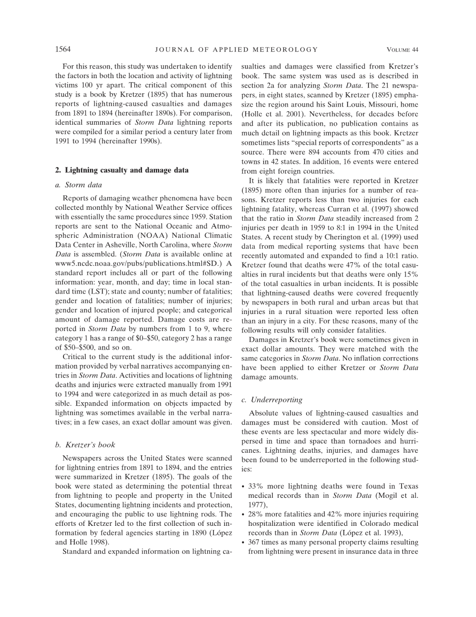 用于分析Storm Data的第2a节。在通过对八个州的21个报纸由Kretzer(1895年)扫描,强调了密苏里州圣路易斯附近的地区(Holle等,2001)。然而,在出版之前和之后的几十年里,没有出版物包含与本书有关的闪电影响的详细信息。克雷泽有时以“记者特约报”作为数据来源。来自470个城市的894乡镇42个州的城镇。 另外还有8个国家涉及到了16个事件。