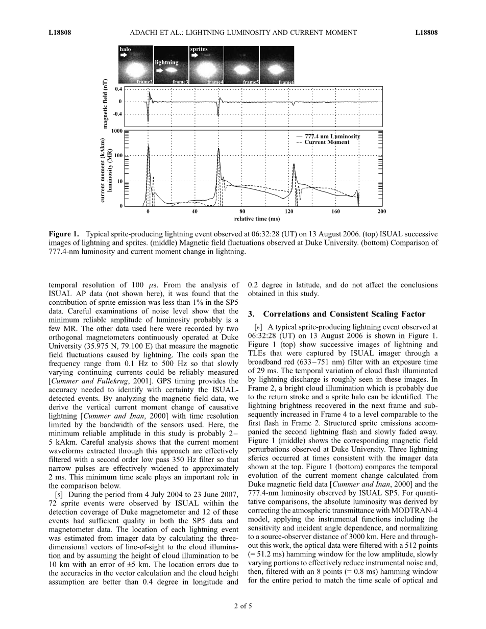 图1所示。2006年8月13日,在06:32:28(UT)观察到的典型的闪电发生的闪电事件。(上图)闪电和精灵的连续图像。(中)Duke大学的磁场波动。(下图)对777.4 nm的光度和电流矩变化的比较。