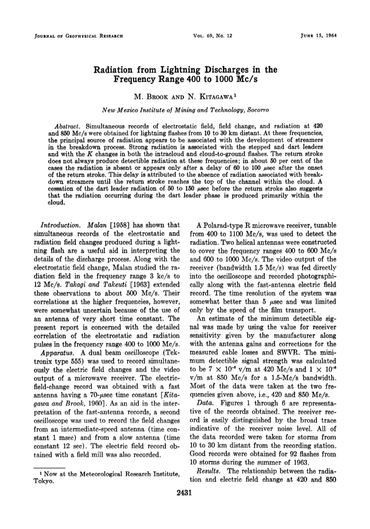 Takagi, M., and Tosio Takeuti, Atmospherics radiation from lightning discharges, Proc. Res.Inst. Atmospherics, Nagoya Univ., 10, 1-11, 1963