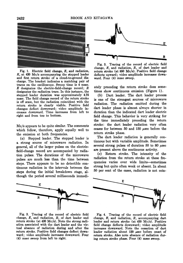 图1:电场变化,E,辐射,R,420Mc/s伴随梯级先导和云对地放电的首次回击