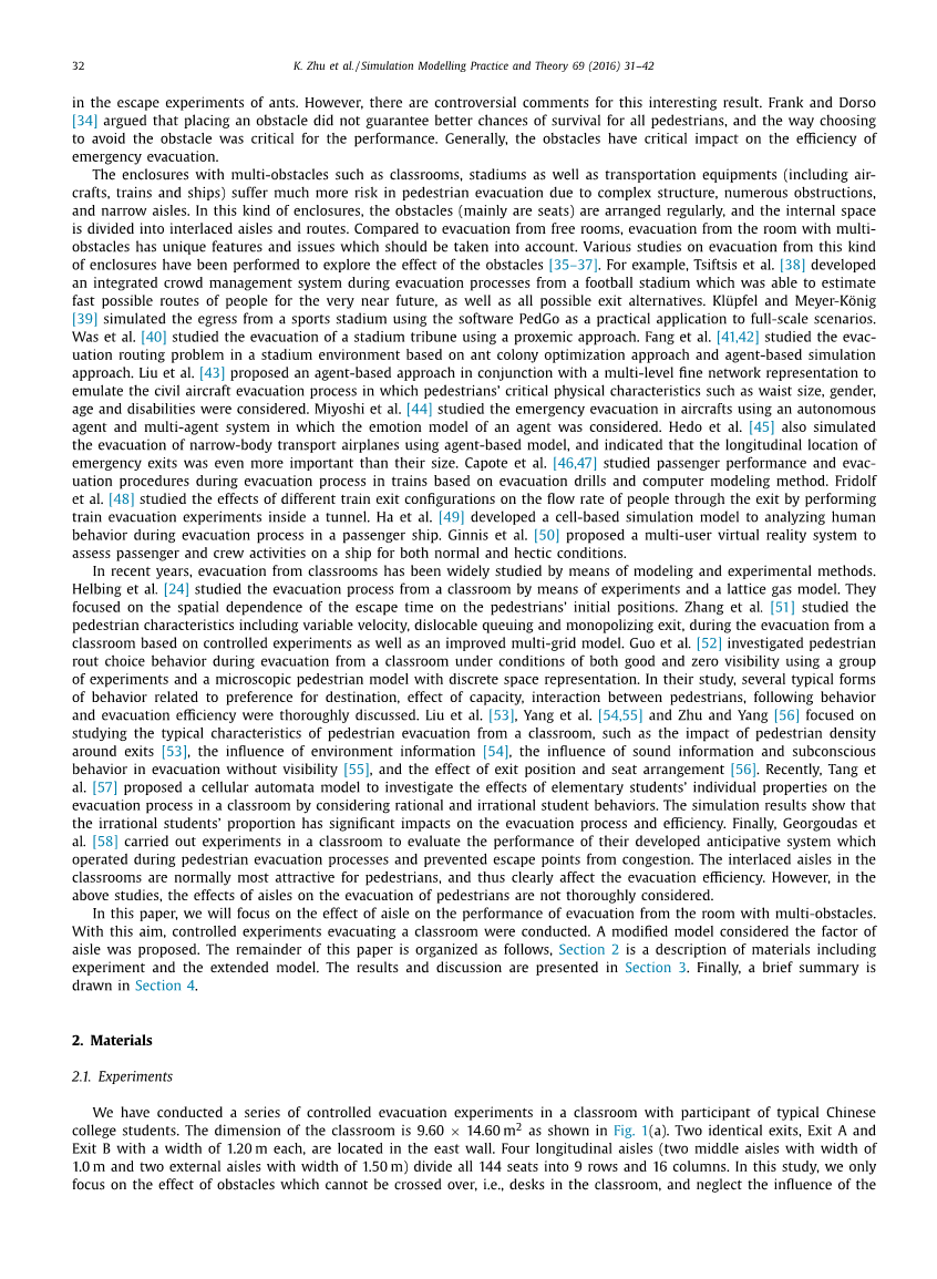 近年来,许多学者通过建模和实验的方法对教室中人员疏散进行了广泛的研究。何兵等人[24]通过实验和格子气模型研究了教室中人员疏散过程。他们在逃逸时间和行人对初始位置的空间依赖这两个方面进行了研究。张等人[51]研究了行人的变速、异位排队和垄断出口等特征,利用研究结果改进了多格网模型。郭等人[52]进行了一组实验并且用具有离散空间表示的微观行人模型,研究在良好可见度和零可见度的条件下,疏散人员从教室撤离时的选择行为。他们对目的地偏好、运动能力、行人之间的相互作用、跟随行为和撤离效率相关的几种典型行为形式进行了深入的讨论。刘等人[53],杨等人[54、55]和朱海洋和杨欣[56]研究了行人疏散的典型特征,如行人密度[ 53 ]的影响、环境信息[ 54 ]的影响、声音信息和潜意识的影响、没有能见度的疏散行为[ 55 ]、出口位置和座位安排的影响[ 56 ]。最近,唐[57]提出了一个元胞自动机模型,该模型考虑了学生的个人属性比如理性和非理性的学生疏散过程,模拟结果显示不合理的学生比例对疏散过程和效率造成极大影响。最后,Georgoudas等人[58]运用在教室进行实验的方法来评估预期的系统的性能,在行人疏散过程中进行引导从而防止出口的堵塞。中间的过道对行人最具吸引力,所以过道会影响了疏散效率。但是在上述研究中,通道对行人撤离的影响尚未得到充分考虑。在本文中,我们将重点介绍过道对多障碍物室内撤离效能的影响。为此,在教室进行了一场疏散实验并提出了一个考虑过道因素的修改模型。本文的其余部分组织如下,第2部分是材料的描述,包括实验和扩展模型。第3节是结果和讨论。第4节是简要总结。