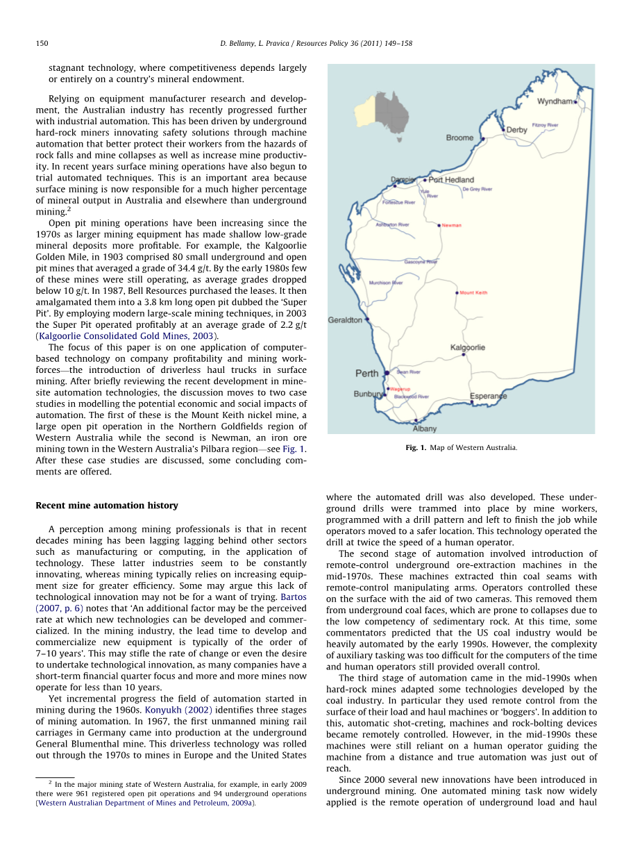 本文的重点是计算机技术对提升矿业公司盈利和优化矿业劳动力的优化——在露天矿山引入无人驾驶卡车。在简要回顾了近年来矿山自动化技术的发展之后,话题转向研究两处引入自动化技术的露天矿对经济和社会的影响。第一处是位于西澳大利亚州Northern Goldfields地区的Mount Keith镍矿。第二处是位于西澳大利亚州Pilbara地区的Newman铁矿—见图1。在对这些案例研究之后,发表一些结论性的意见。